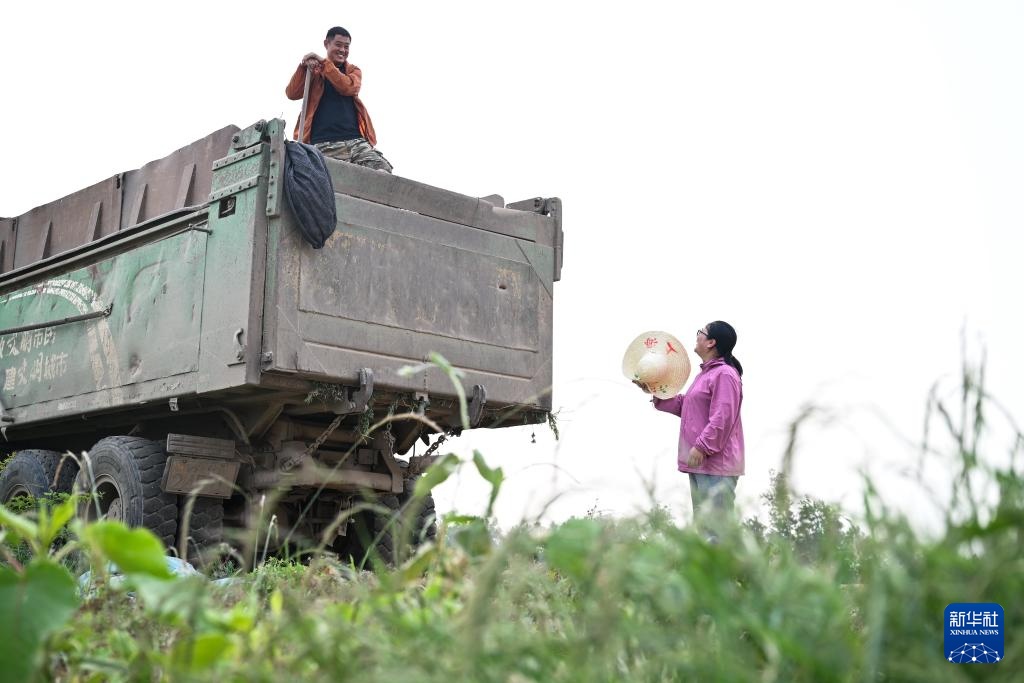 5月27日,刘凯在劳作间隙与妻子胡芳婷交流小麦收获情况。