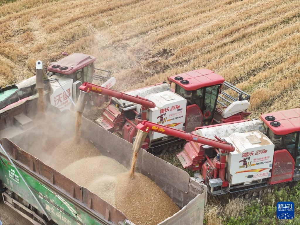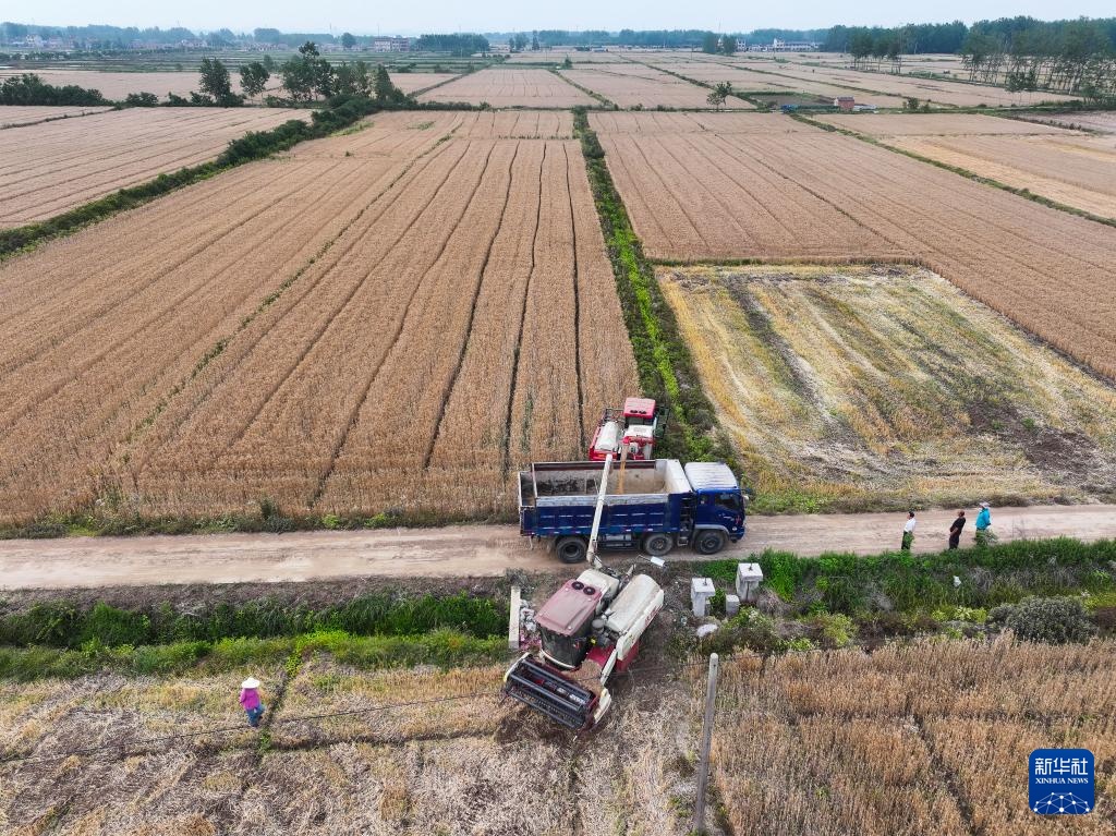 在盱眙县种粮大户刘凯的承包田旁,收割机将小麦装车(5月27日摄,无人机照片)。