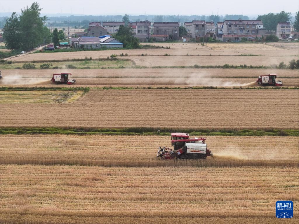 在盱眙县种粮大户刘凯的承包田,农机手驾驶收割机抢收小麦(5月27日摄,无人机照片)。