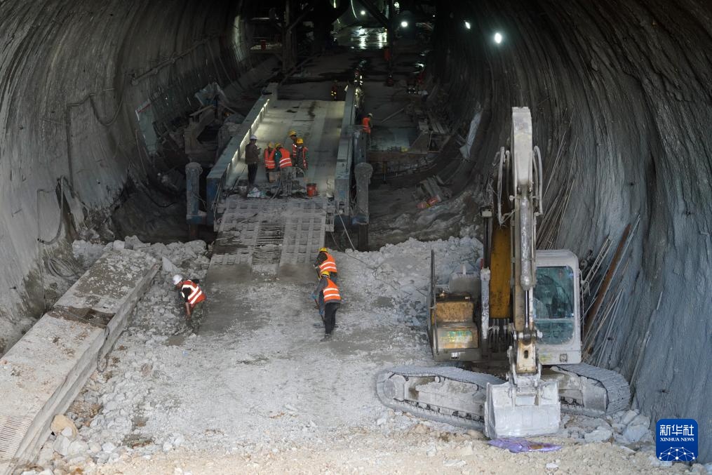 5月27日,工人在滨绥铁路绥芬河至国境线扩能改造工程新建绥芬河隧道中施工。