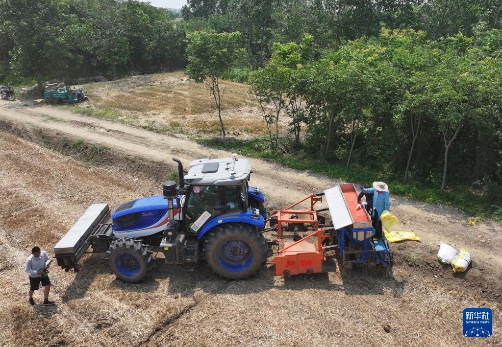 5月28日,三河农场职工向扬州大学研制的“九合一”稻麦耕播机内装稻种(无人机照片)。