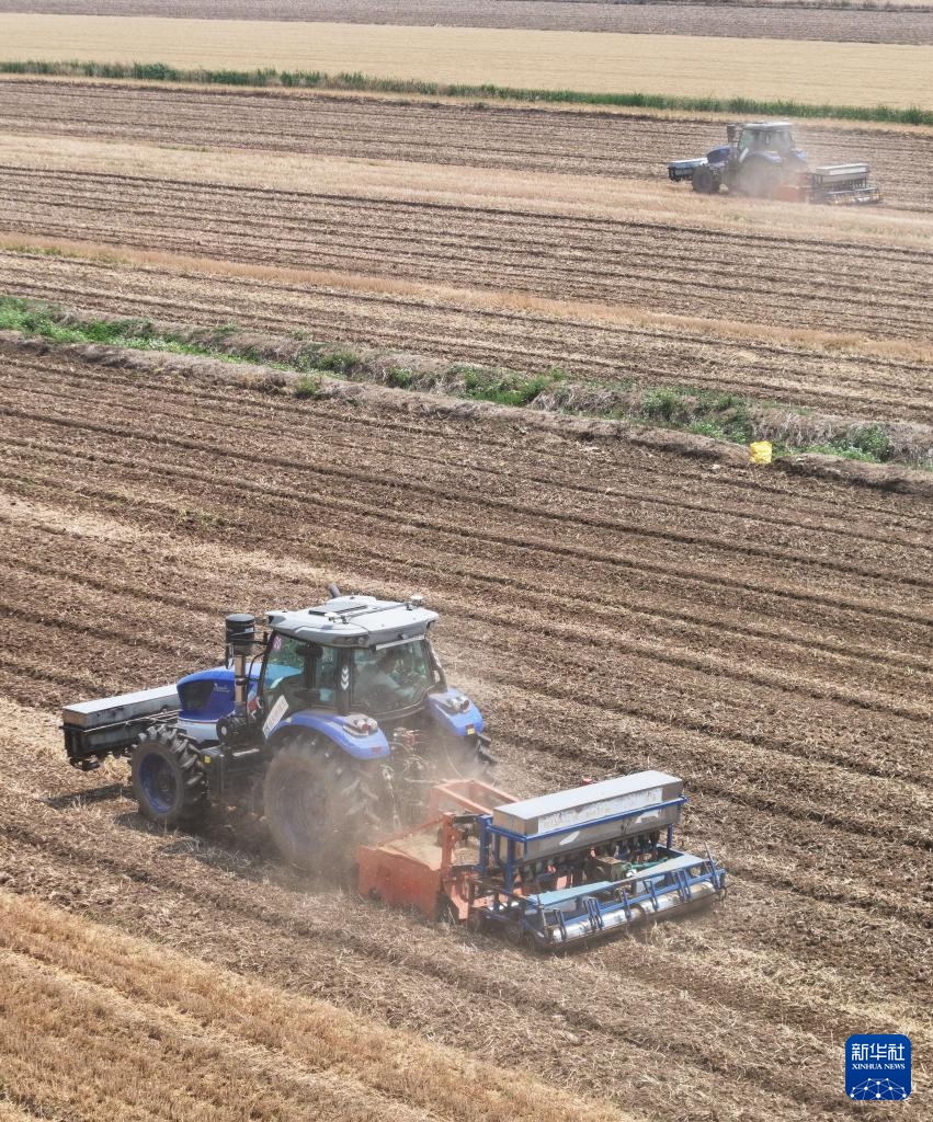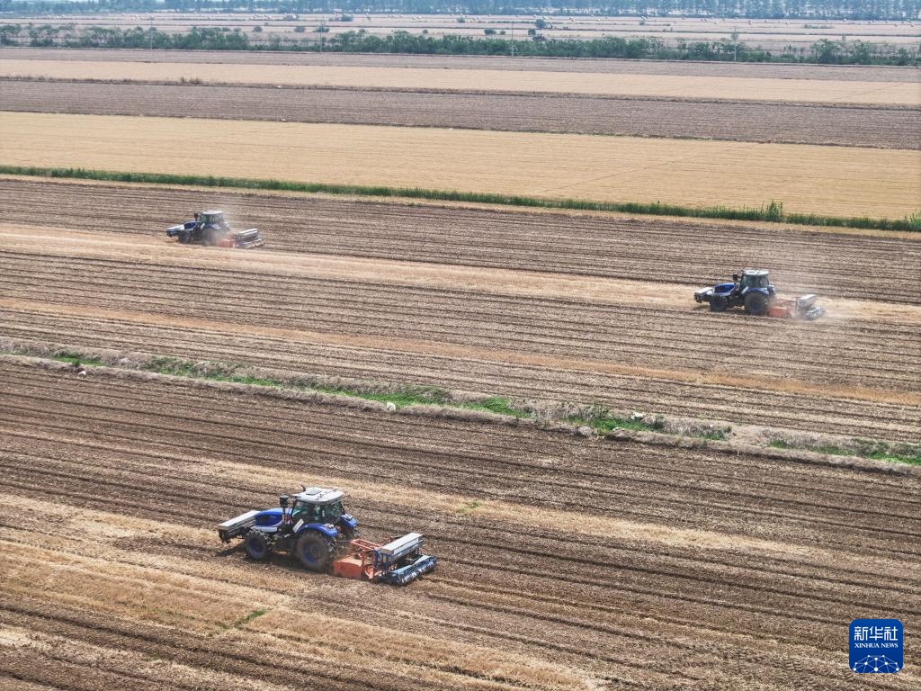 5月28日,扬州大学研制的“九合一”稻麦耕播机在三河农场播稻种(无人机照片)。
