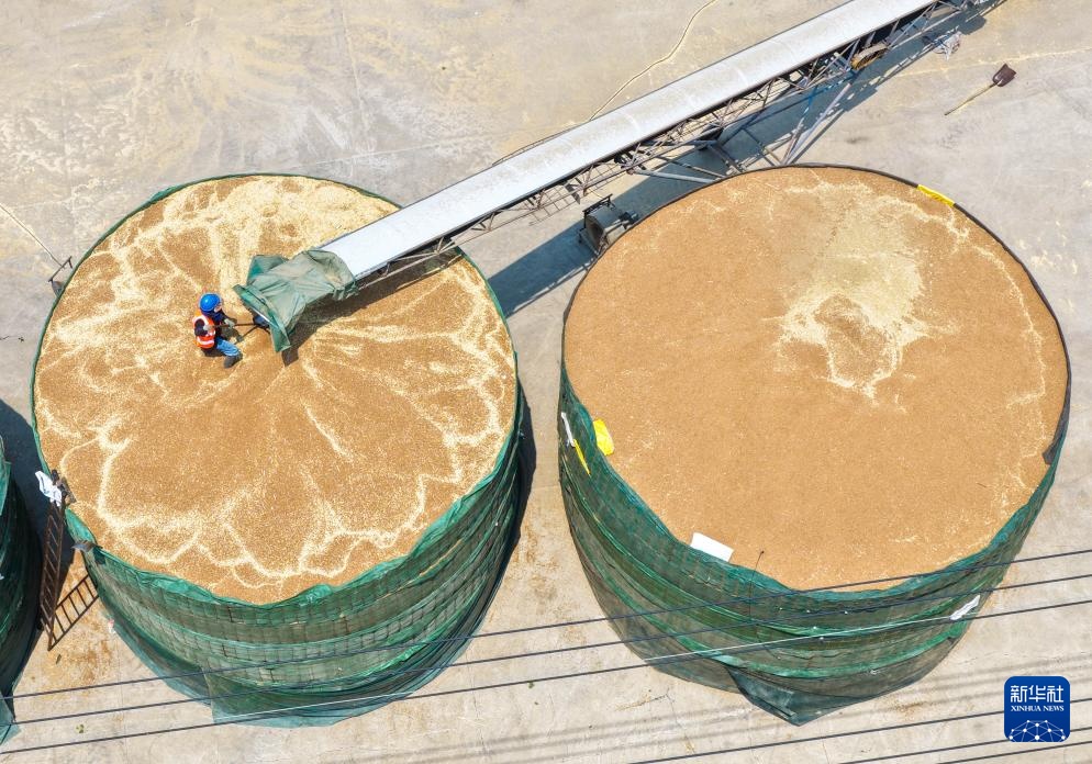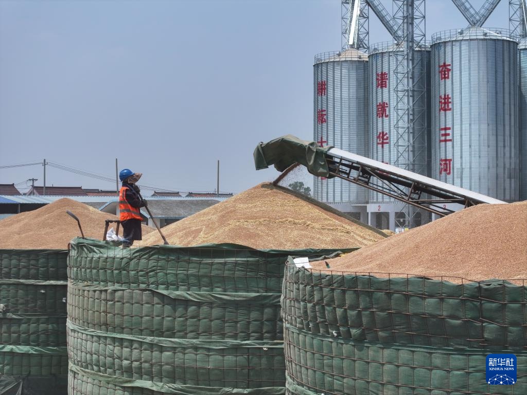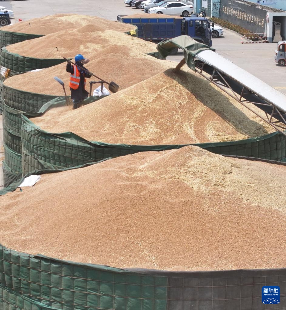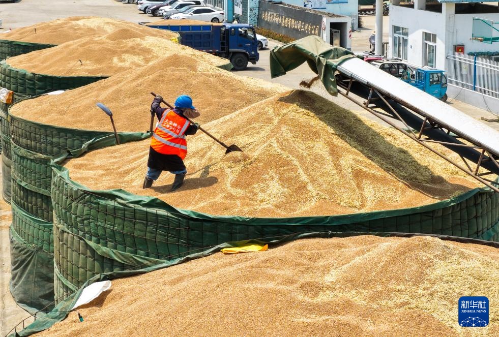 三河农场收获的小麦进入大华种业三河分公司存储(5月28日摄,无人机照片)。