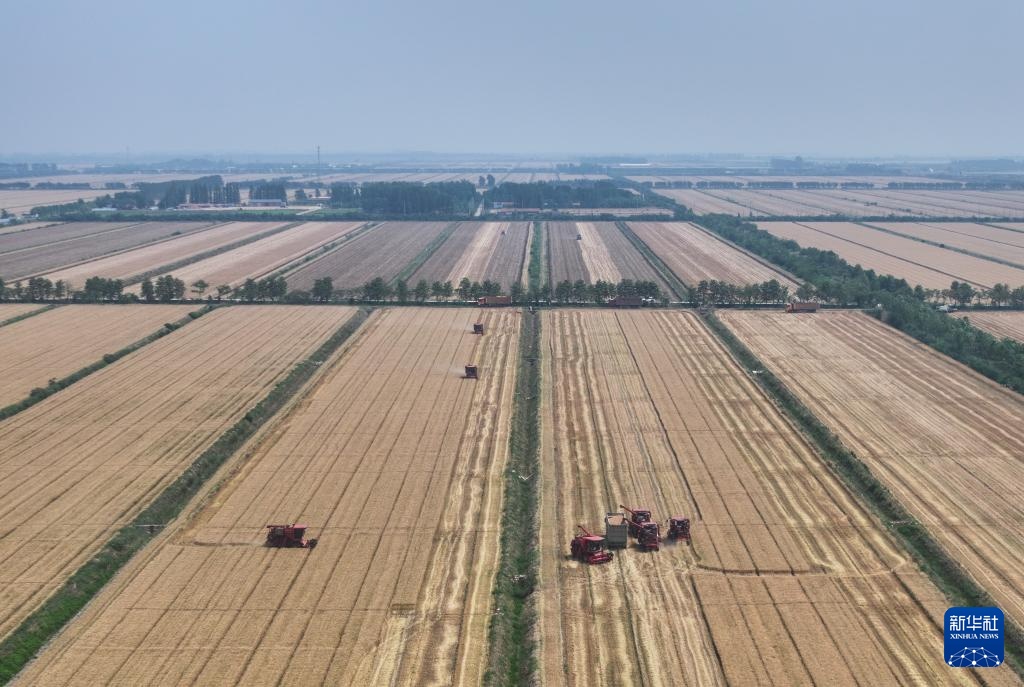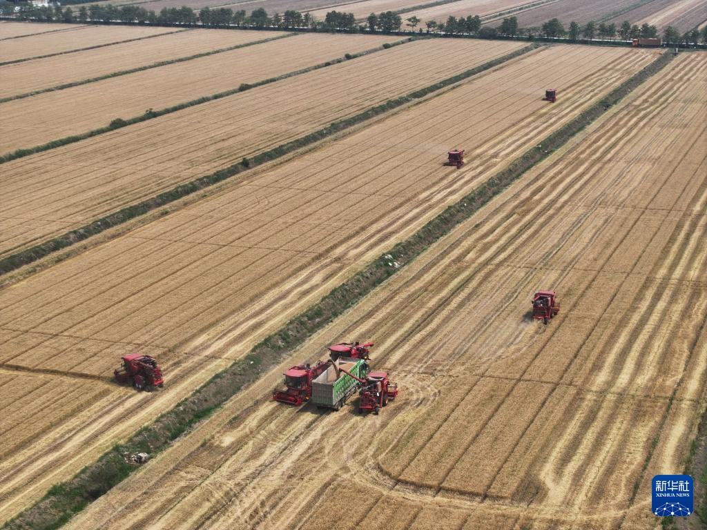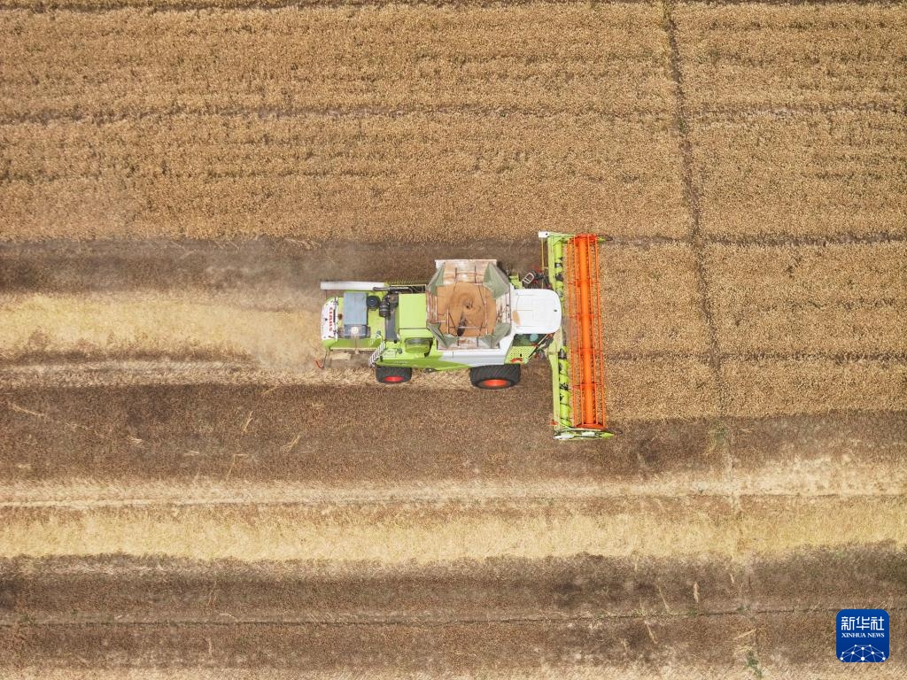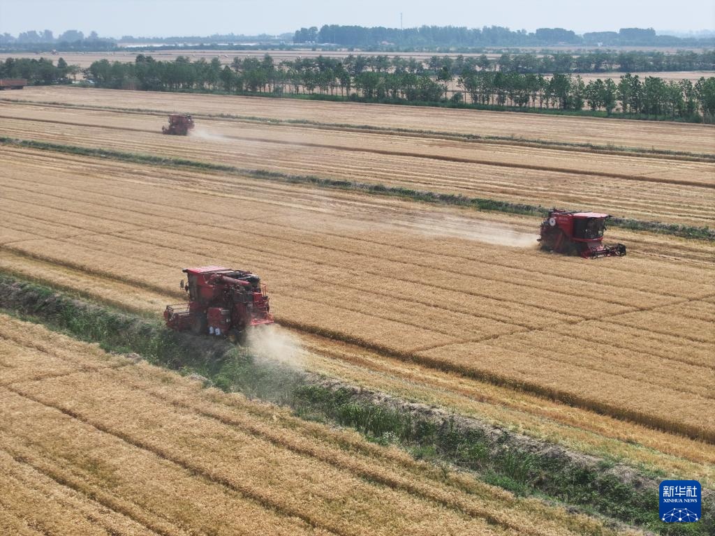 5月28日,收割机在三河农场收割小麦(无人机照片)。