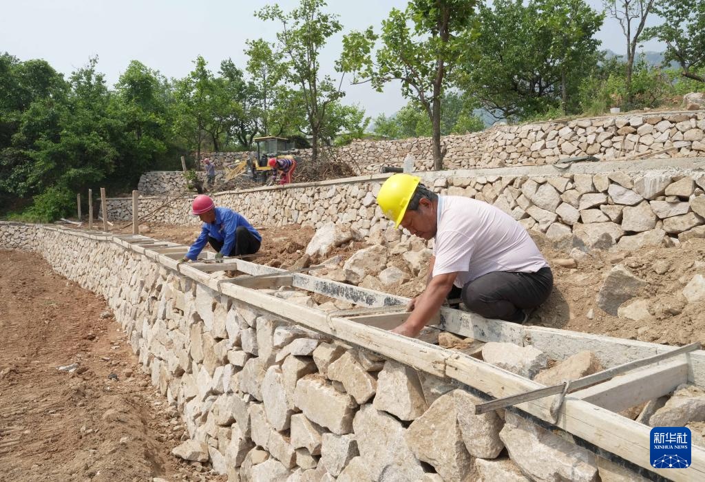 5月28日,工人在河北省卢龙县刘田各庄镇境内的柳河北山小流域综合治理工程工地修建山地护坡。