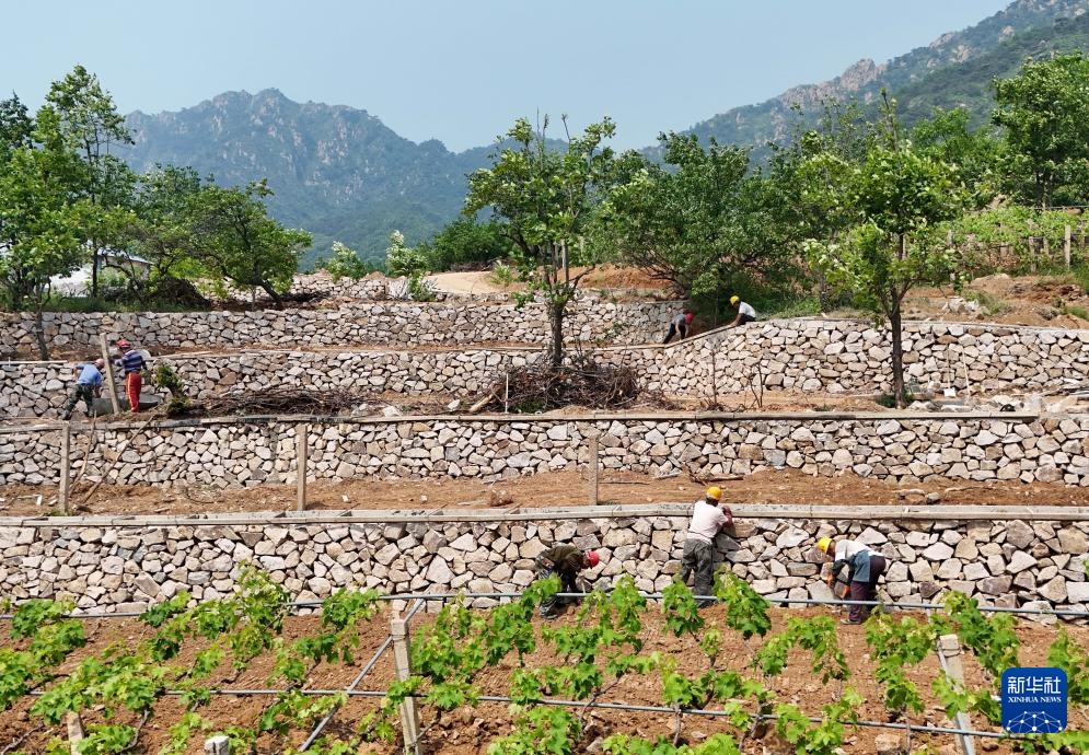 5月28日,河北省卢龙县刘田各庄镇小王柳河村的农民在经过改造的阶梯式果园内除草(无人机照片)。