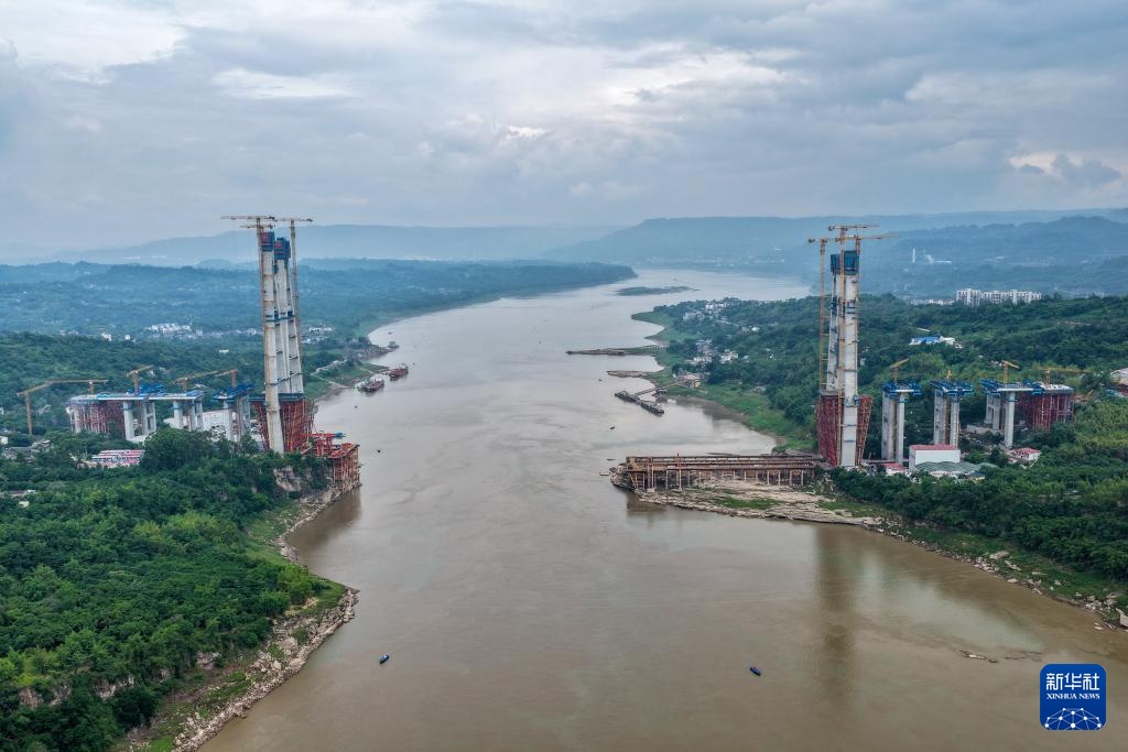石沱长江大桥位于重庆市涪陵区,是渝万高铁全线控制性工程,主桥全长1056米,主跨608米,北岸5号主塔高234.9米,南岸6号主塔高253米。