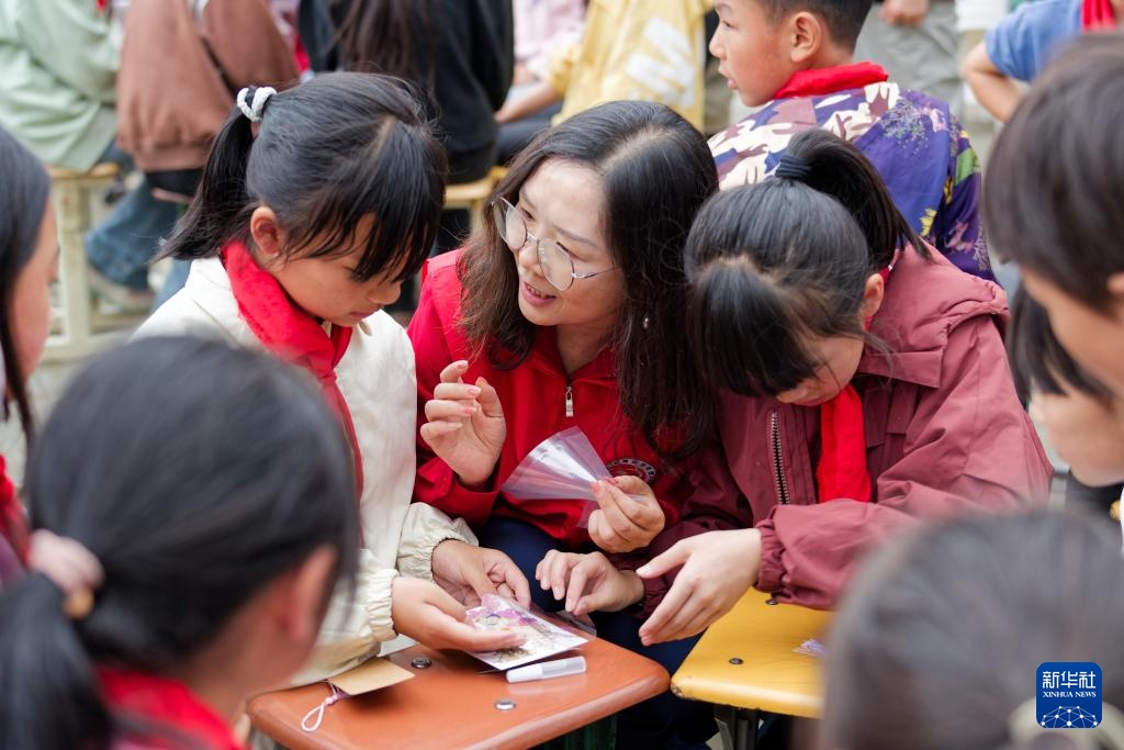 5月28日,在昭通市大关县翠华镇庆云小学,大关县图书馆馆长、“背篼图书馆”志愿服务队队长周荣燕(中)向学生讲解书签的制作方法。