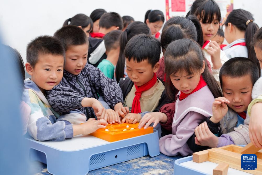 5月28日,在昭通市大关县翠华镇庆云小学,学生们体验益智玩具。