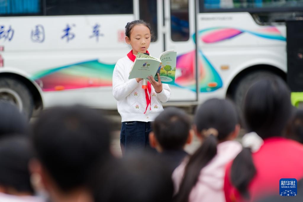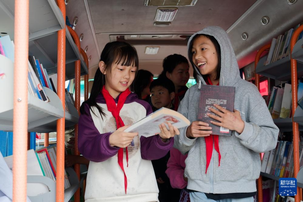 5月28日,昭通市大关县翠华镇庆云小学的学生们在“流动图书车”内挑选感兴趣的书籍。