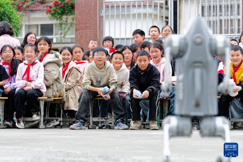 5月28日,在昭通市大关县翠华镇庆云小学,学生们观看四足机器人表演。