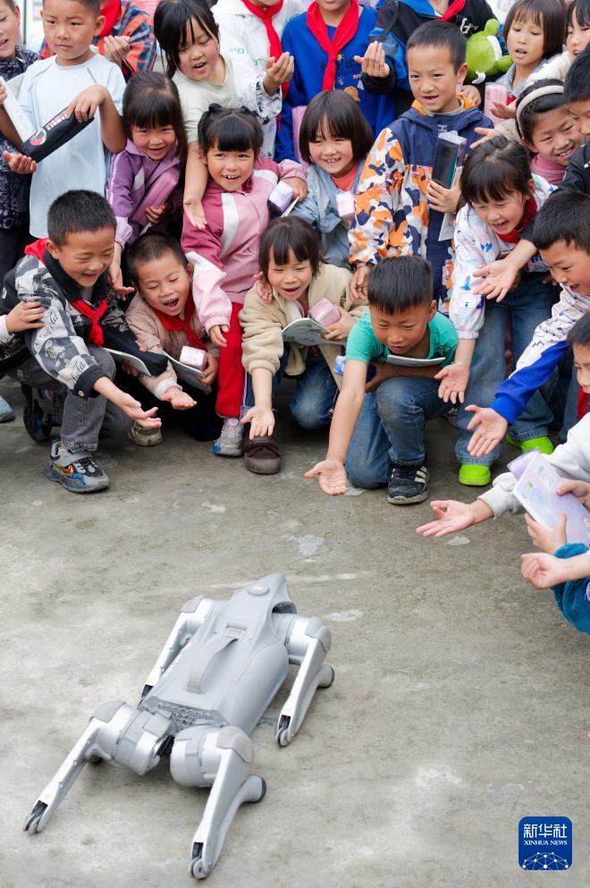 5月28日,在昭通市大关县翠华镇庆云小学,学生们与四足机器人互动。