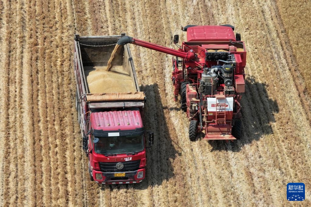 5月28日,在西安市鄠邑区庞光街道庞光村,收割机将收获的粮食装车(无人机照片)。