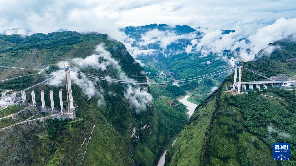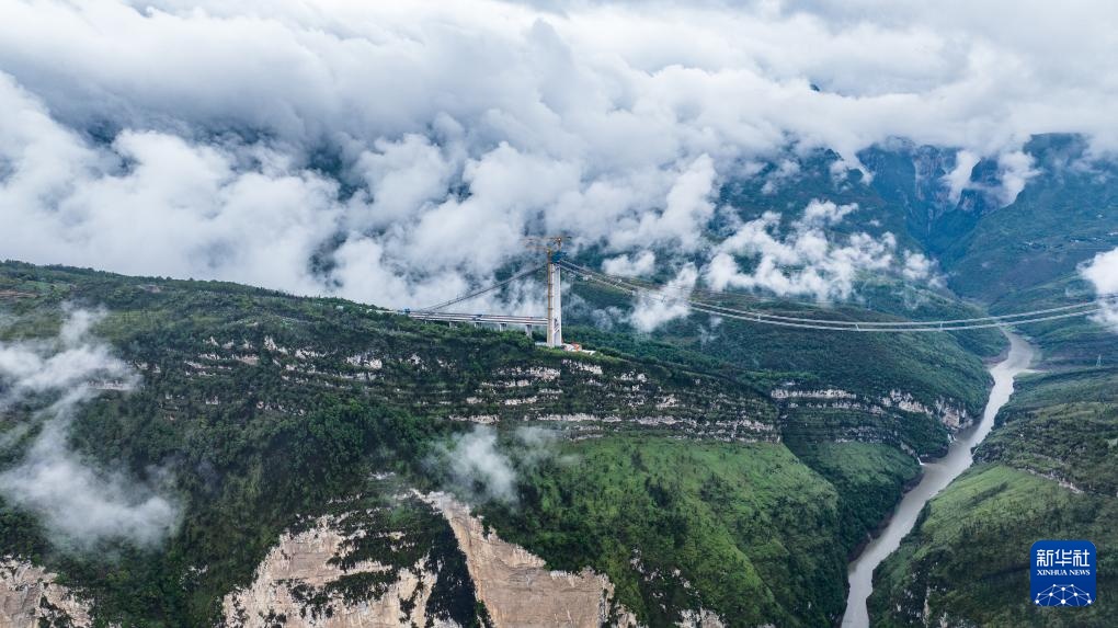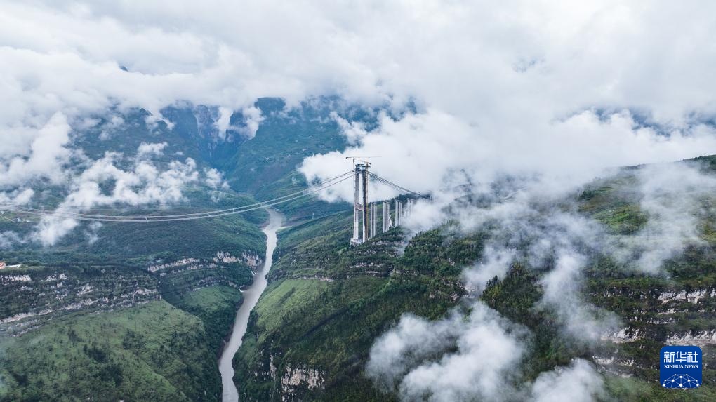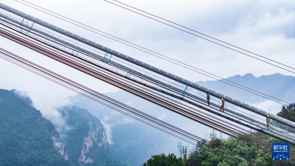 工人在施工猫道上行走,前往作业地点(5月28日摄,无人机照片)。