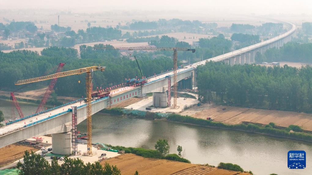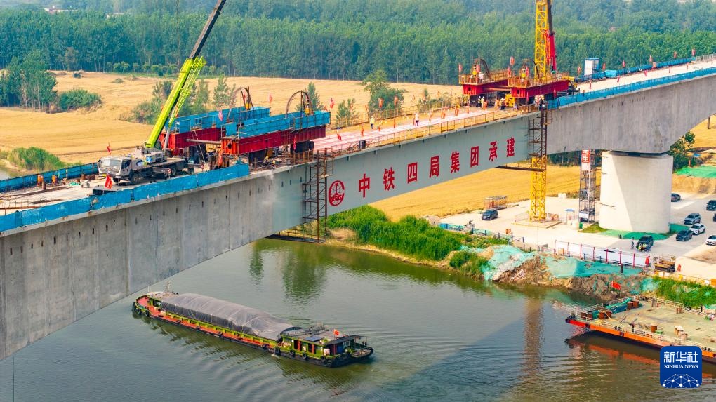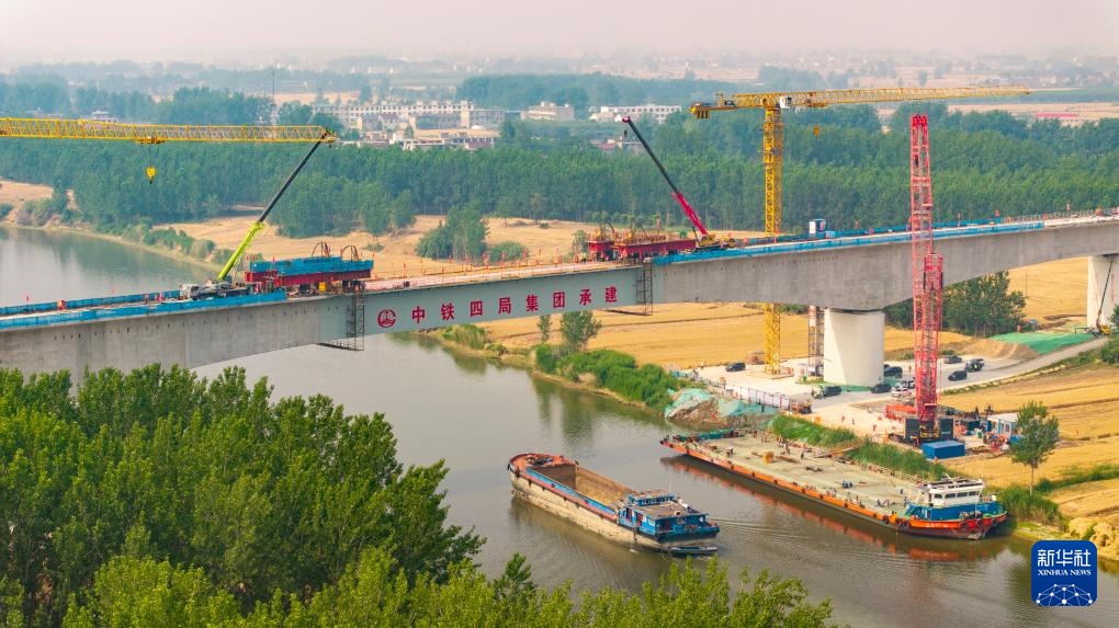 这是正在吊装施工中的阜淮铁路跨涡河特大桥(5月29日摄,无人机照片)。