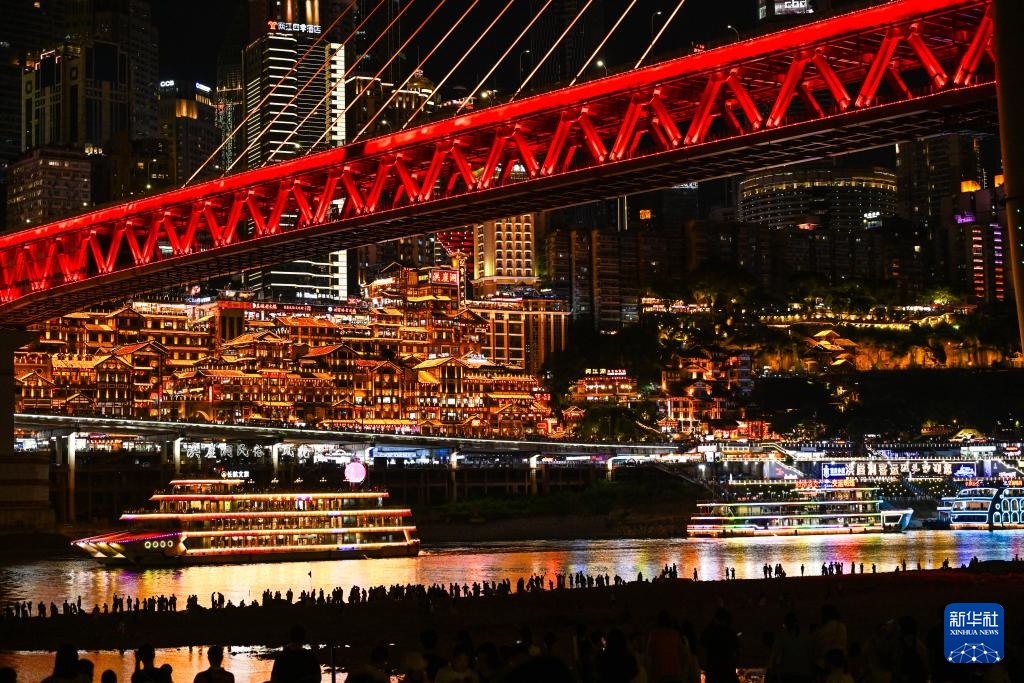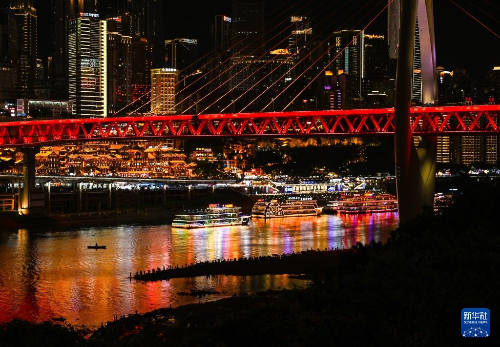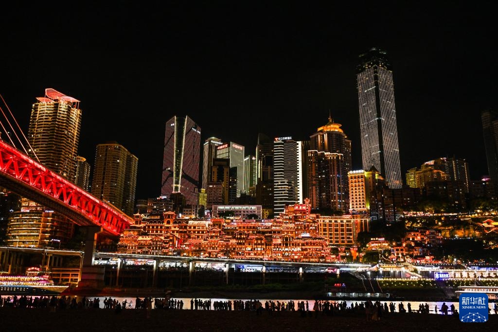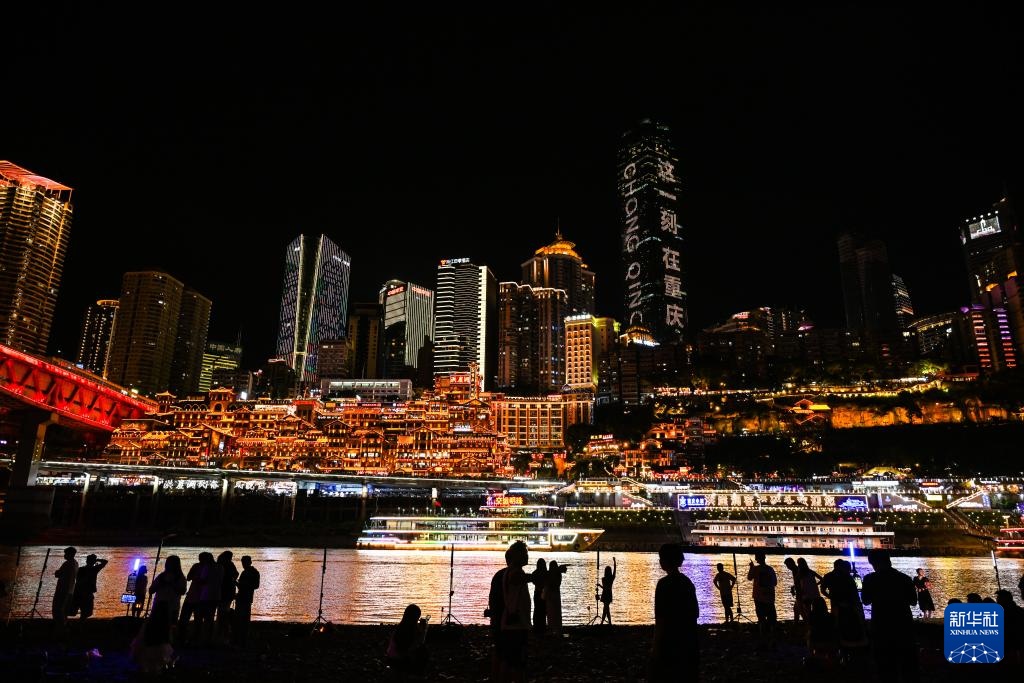 5月28日,游客在嘉陵江边欣赏洪崖洞夜色。