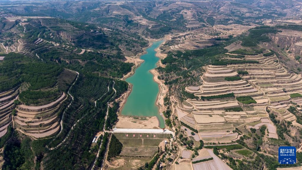 这是5月29日在庆阳市镇原县拍摄的吴家沟水库(无人机照片)。该水库2024年底刚完成综合利用改造,今年旱情期间保障了20万人生活生产用水安全。