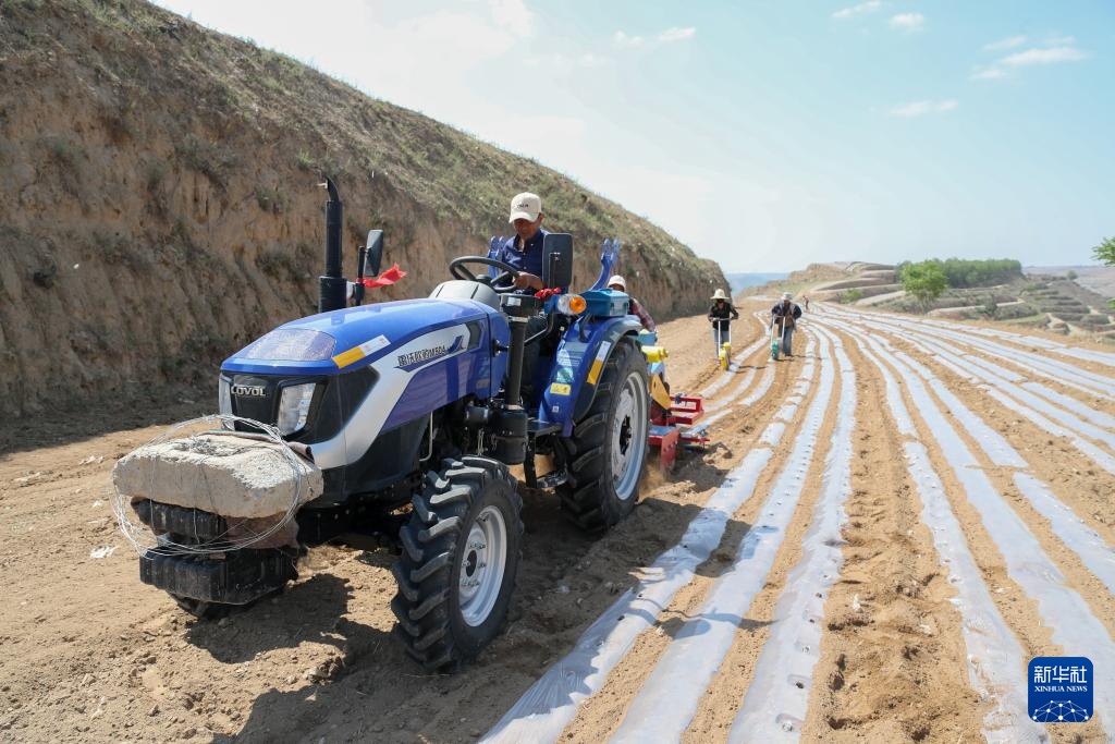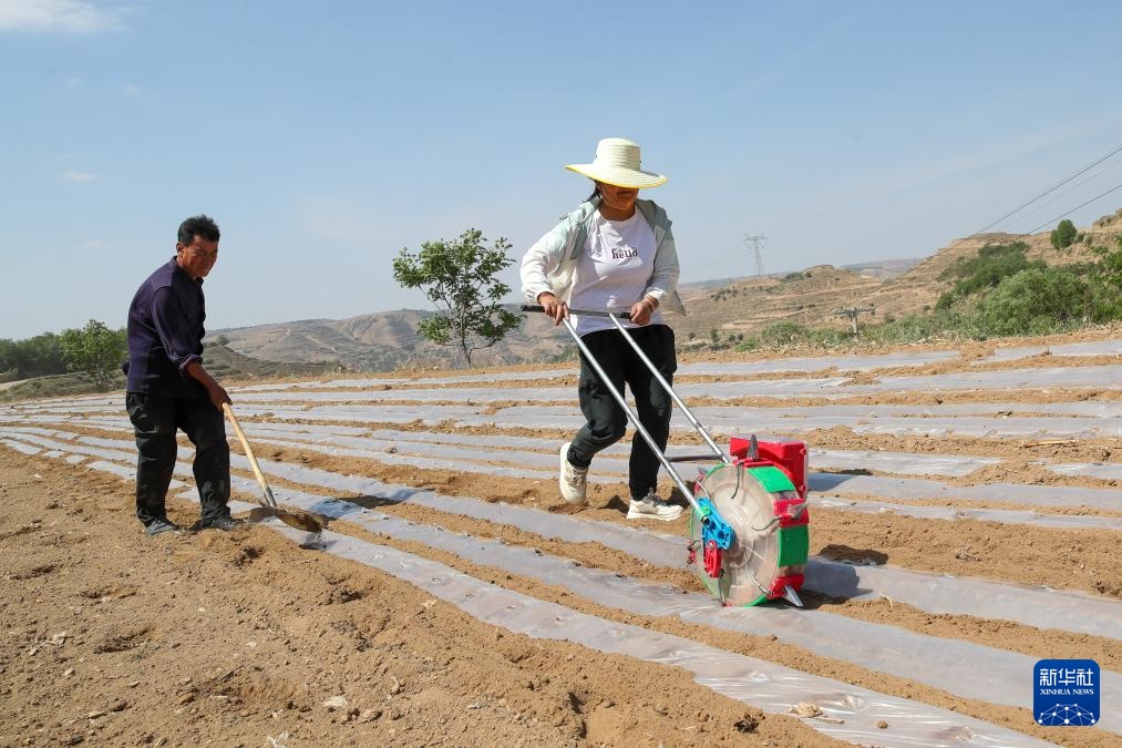 5月29日,在庆阳市镇原县郭原乡郭原村,村民一边用机械覆膜保墒一边播种玉米。