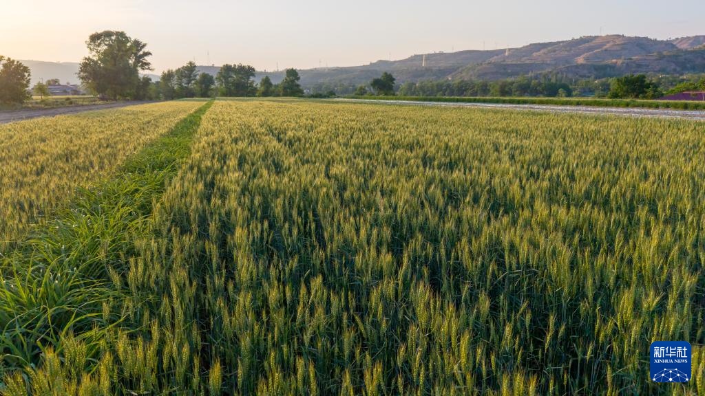 这是5月28日在庆阳市镇原县开边镇兰沟村拍摄的一片灌区麦田(无人机照片)。