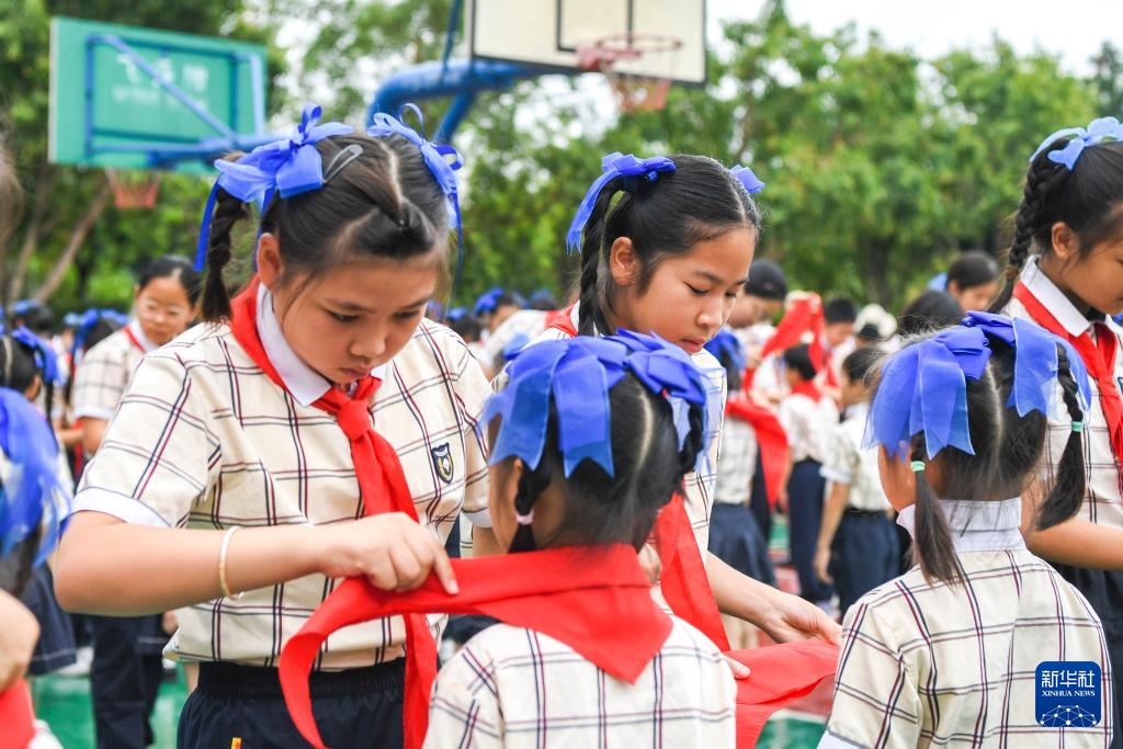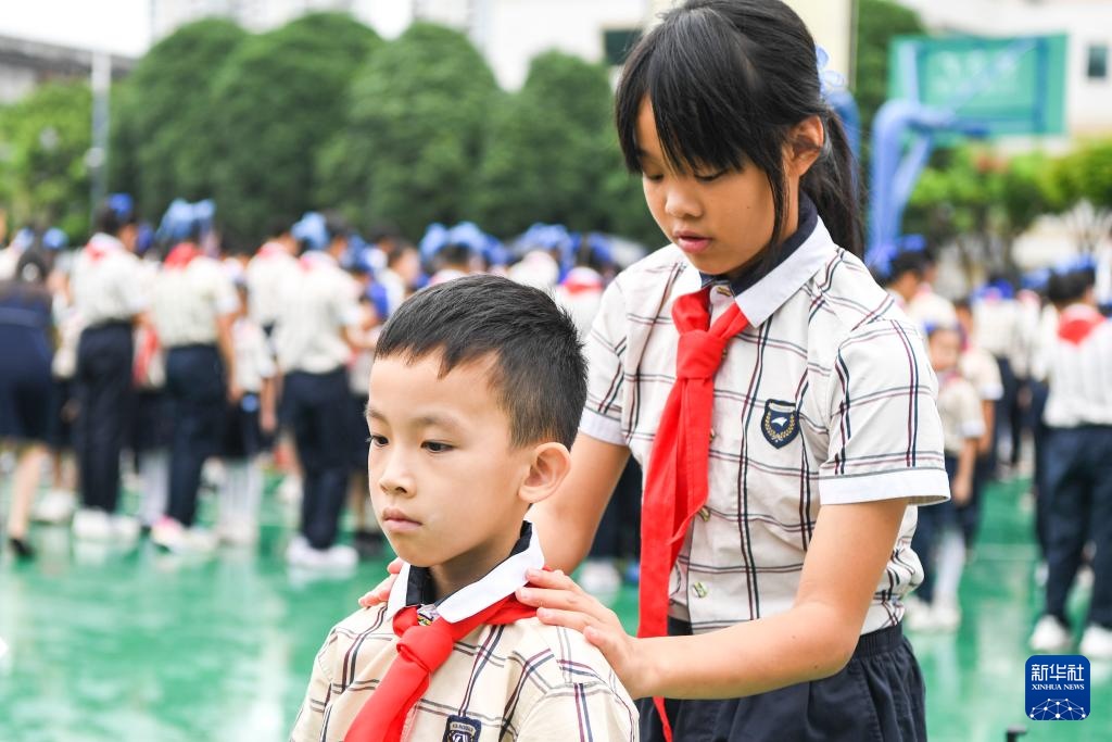 5月30日,在广西南宁市滨湖路小学教育集团滨湖校区少先队员入队仪式上,高年级学生为新队员戴红领巾。