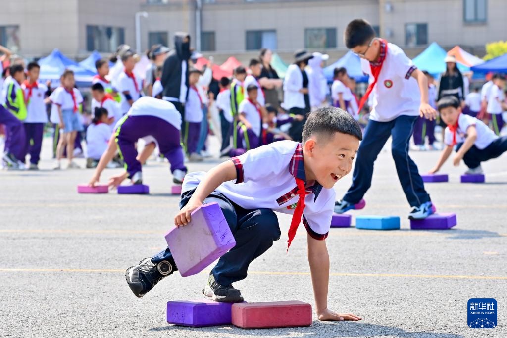 5月30日,在辽宁省鞍山市岫岩满族自治县实验小学,学生在趣味运动会上进行“移石过河”游戏。