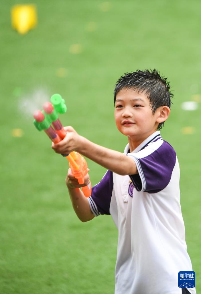 5月30日,重庆两江新区巴蜀学校学生在“水趣童乐”活动中玩水枪。