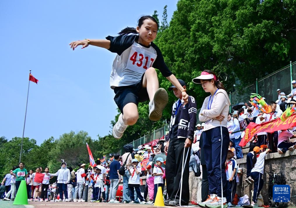 5月30日,青岛市实验小学学生参加跳远比赛。