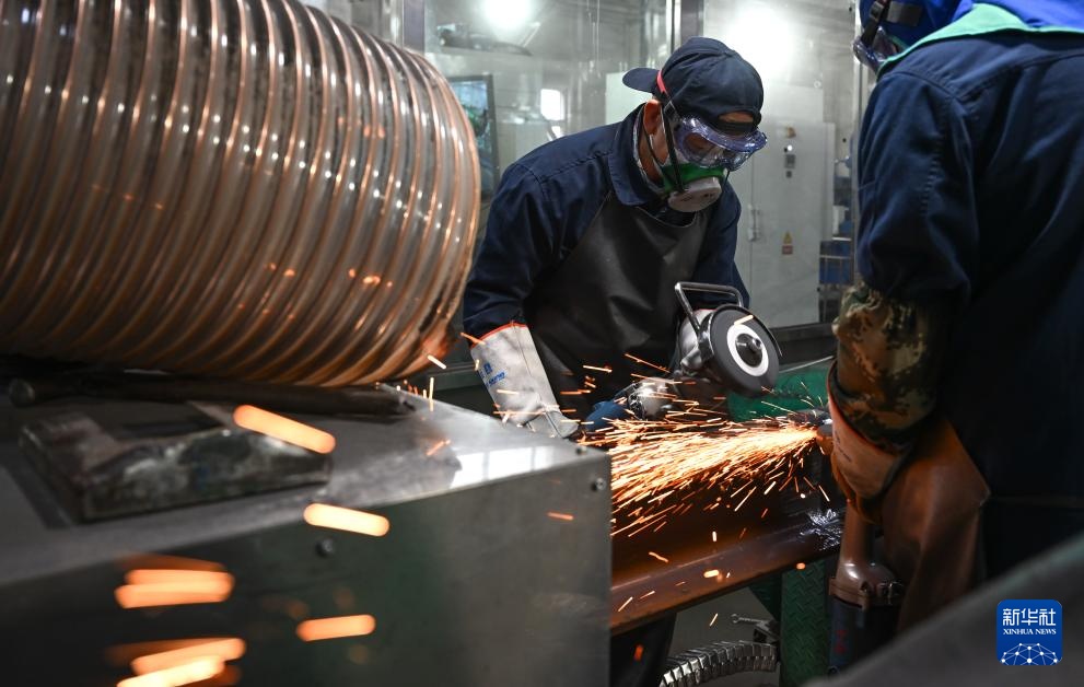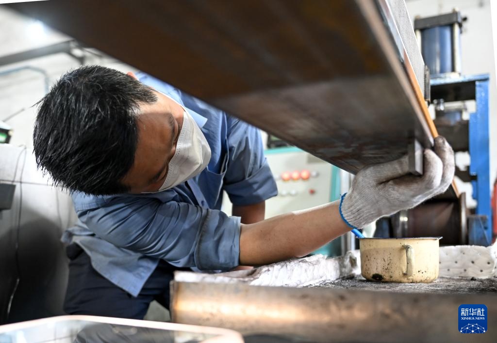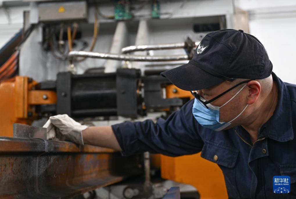 5月30日,工作人员在内蒙古呼和浩特市中国铁路呼和浩特局集团有限公司焊轨段打磨钢轨焊接处。