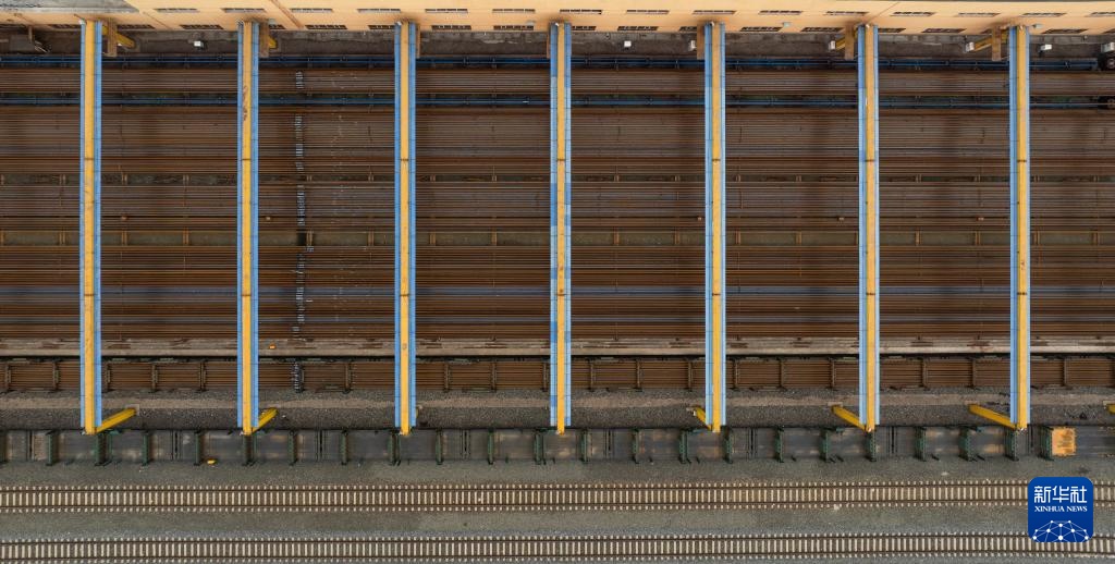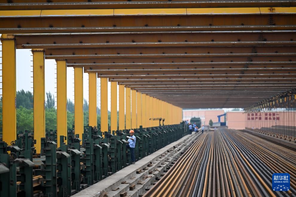 5月30日,在内蒙古呼和浩特市中国铁路呼和浩特局集团有限公司焊轨段拍摄的500米长钢轨(无人机照片)。