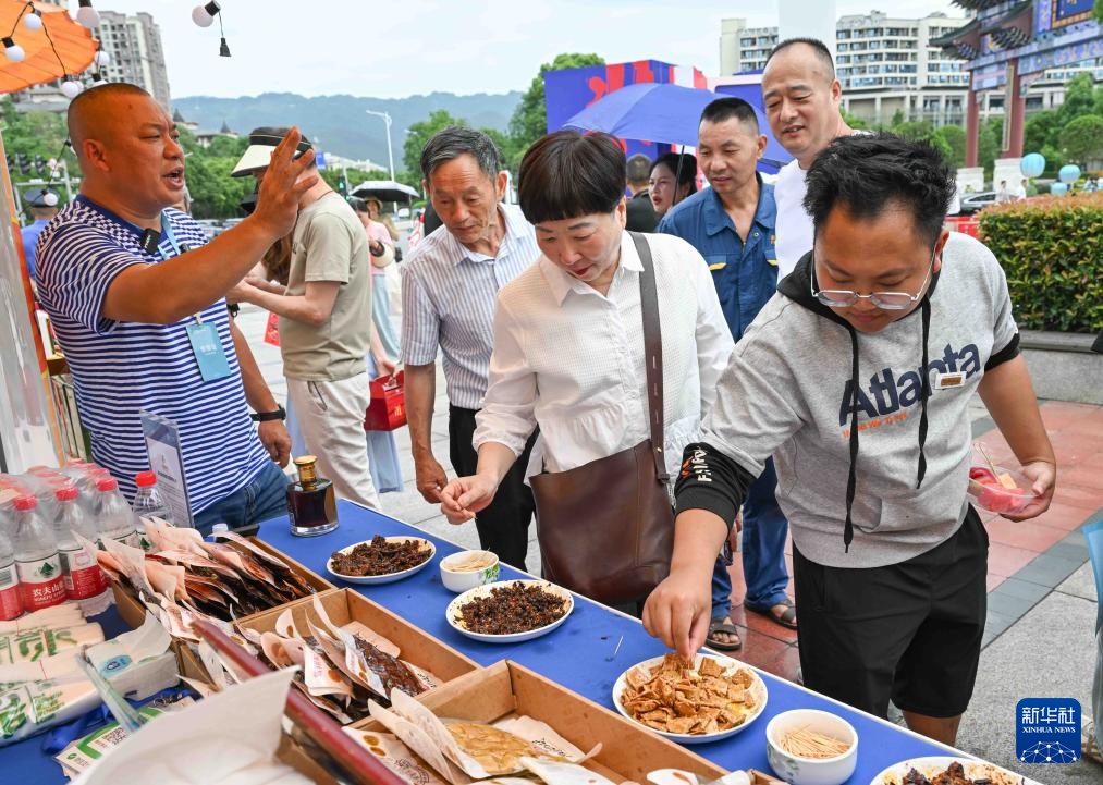 5月30日,游客在重庆市永川区兴龙湖广场品尝选购特色美食。