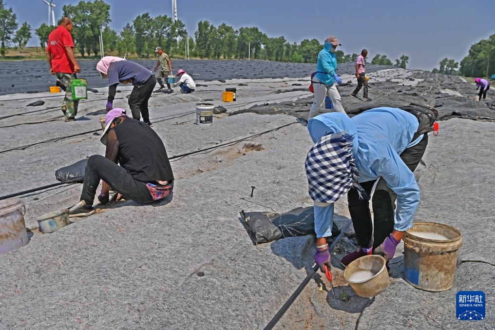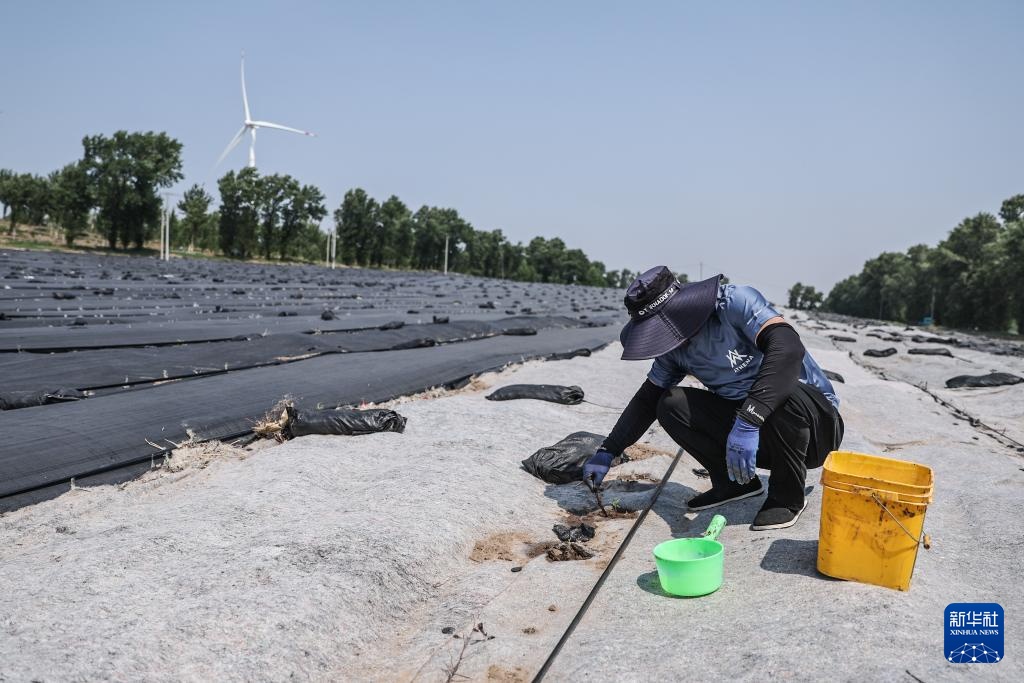 5月29日,工作人员在彰武县章古台镇光伏+治沙生态产业项目现场对光伏板进行维护。