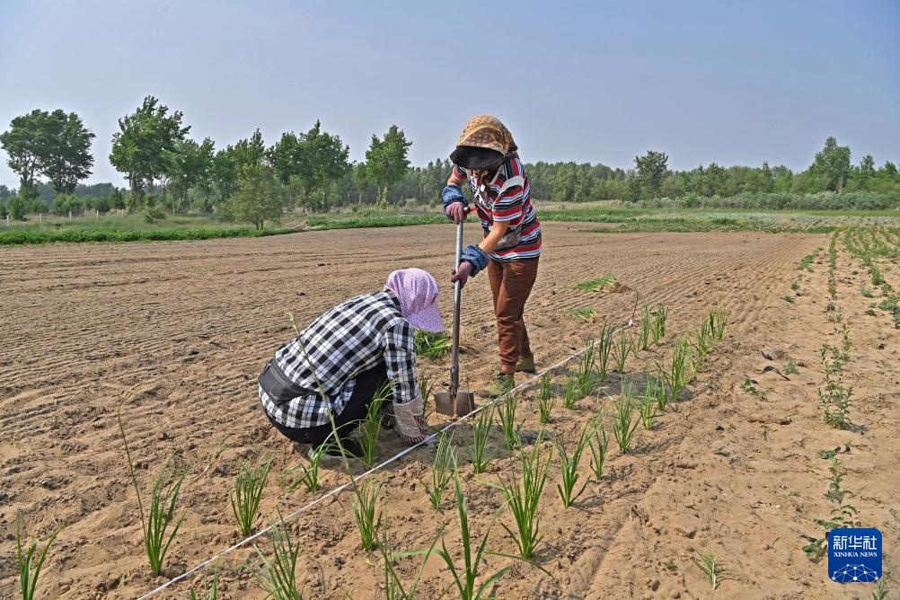 5月29日,农户在彰武县大德镇沙化土地蒿柳养蚕项目现场检查蒿柳长势。