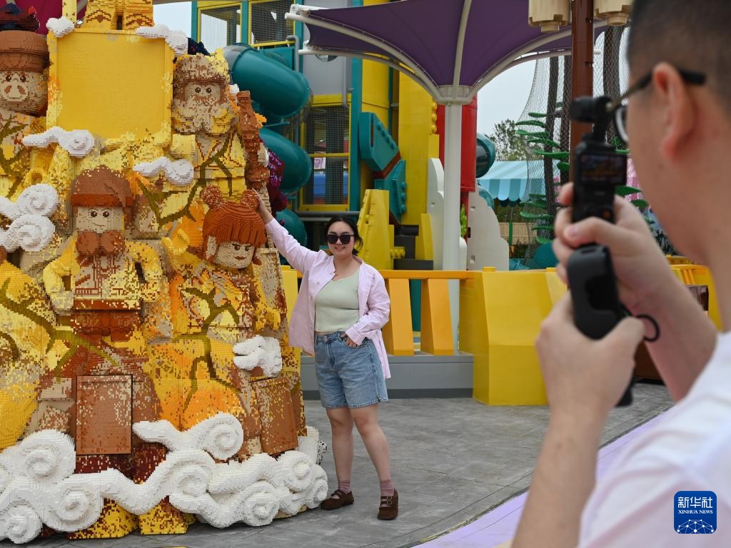 5月31日,参加上海乐高乐园内部测试的游客在乐高模型前拍照。