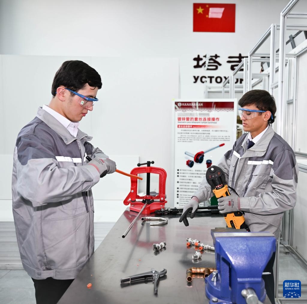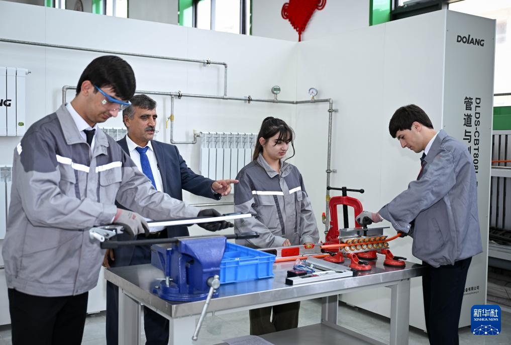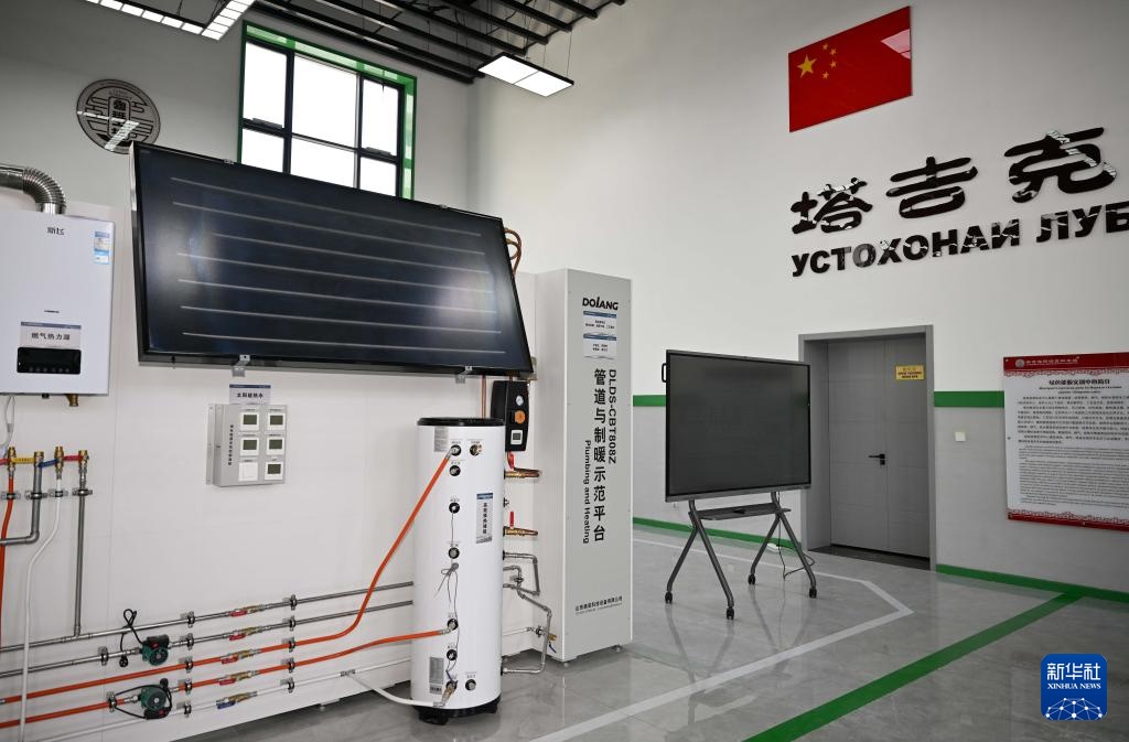 这是5月31日在塔吉克斯坦首都杜尚别的鲁班工坊内拍摄的管道与制暖示范平台。