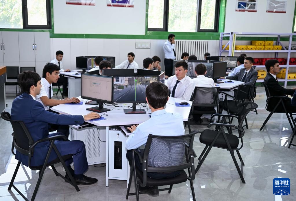 5月31日,学生们在塔吉克斯坦首都杜尚别的鲁班工坊内学习。