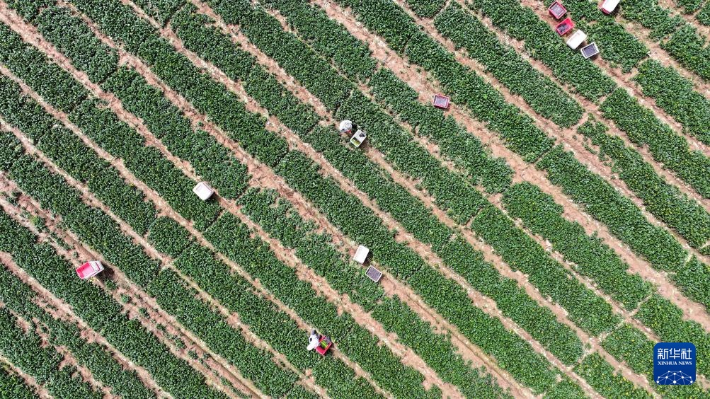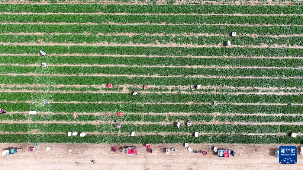 5月29日,采摘工在宁夏青铜峡市瞿靖镇冷凉蔬菜种植基地采摘蔬菜(无人机照片)。