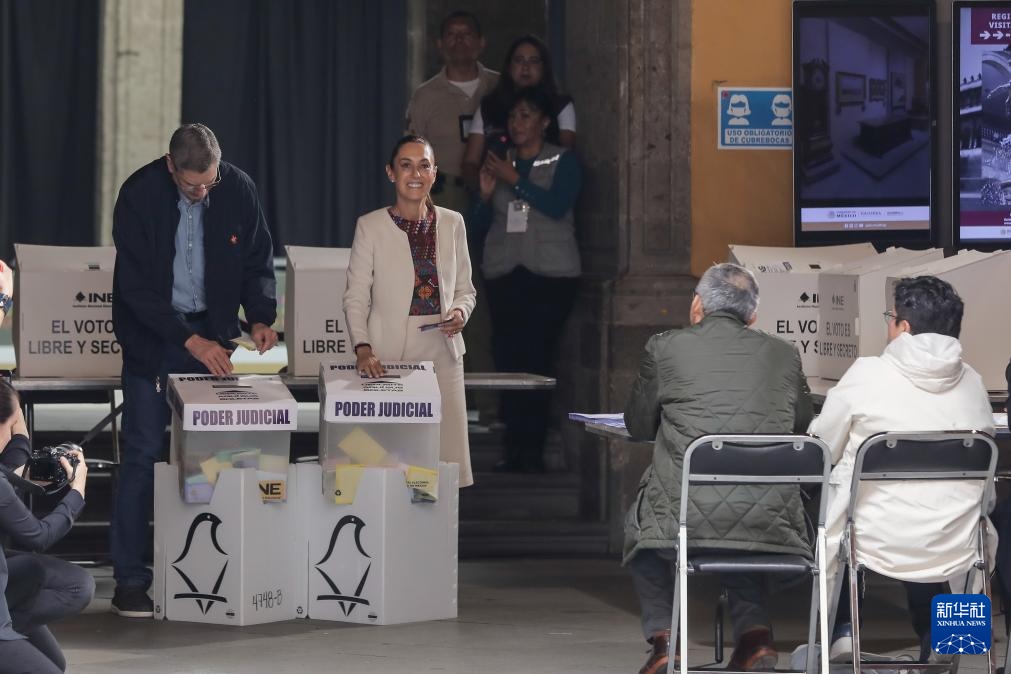 6月1日,在墨西哥首都墨西哥城,总统辛鲍姆(左二)参加司法机构选举投票。