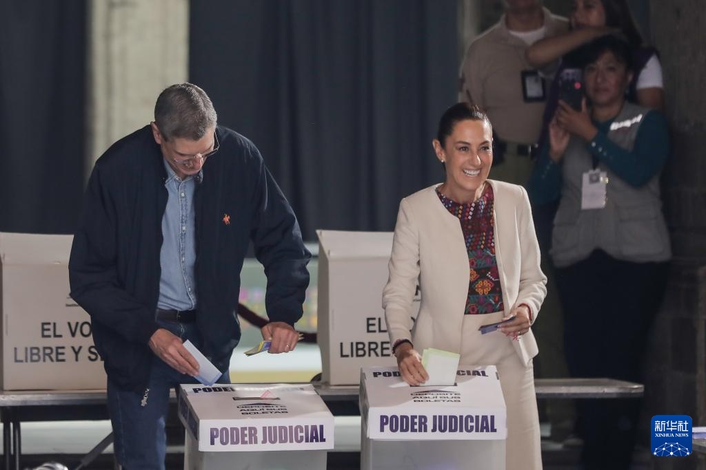 6月1日,在墨西哥首都墨西哥城,总统辛鲍姆(右)参加司法机构选举投票。
