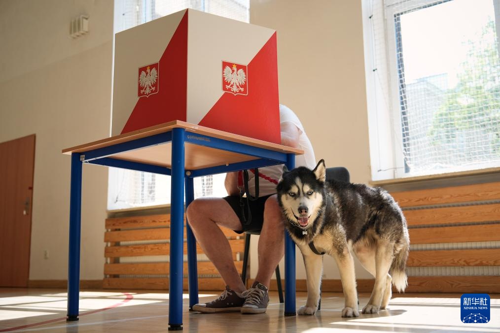 6月1日,选民带着狗在波兰首都华沙一处投票站投票。