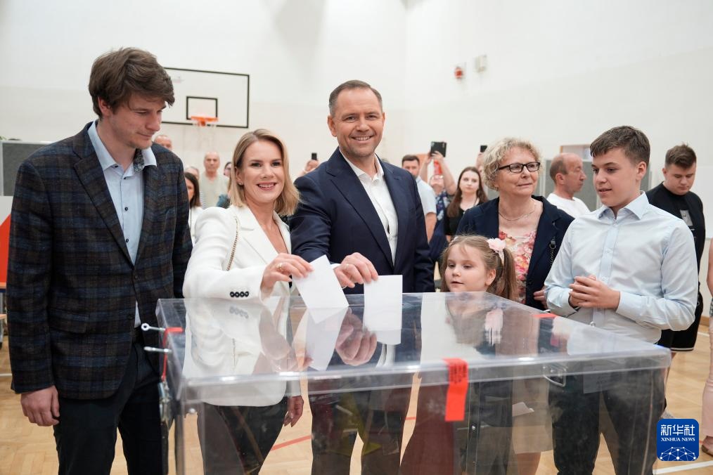 6月1日,独立候选人卡罗尔·纳夫罗茨基(左三)和家人在波兰首都华沙一处投票站投票。