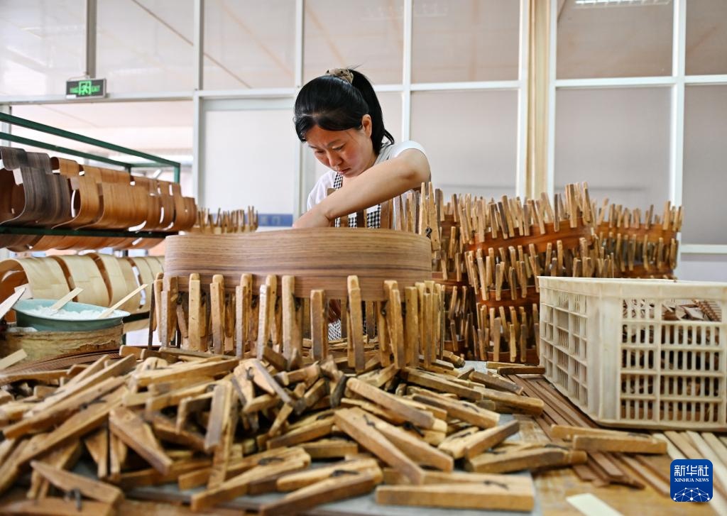 5月28日,河北省武强县一家乐器生产企业的工人在制作尤克里里。