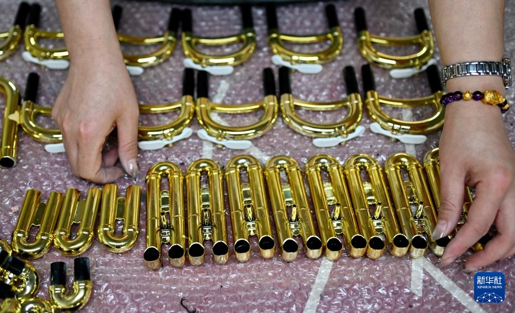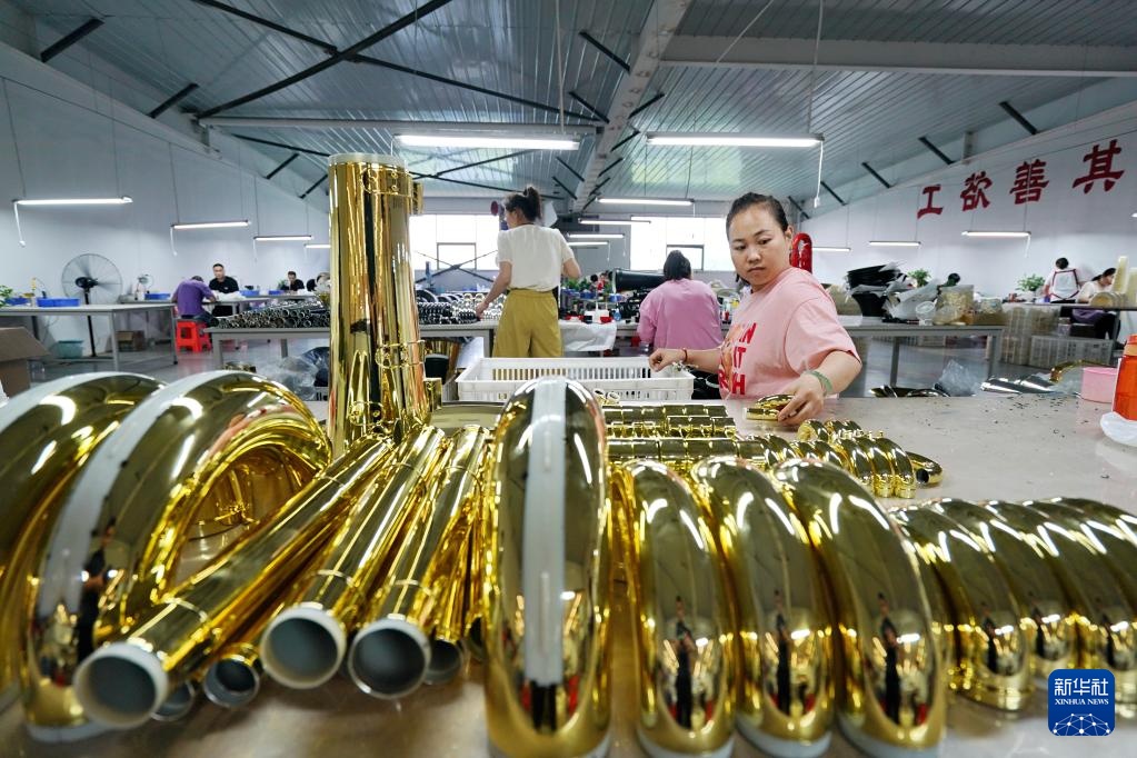 5月28日,河北省武强县一家乐器生产企业的工人在整理小号零件。