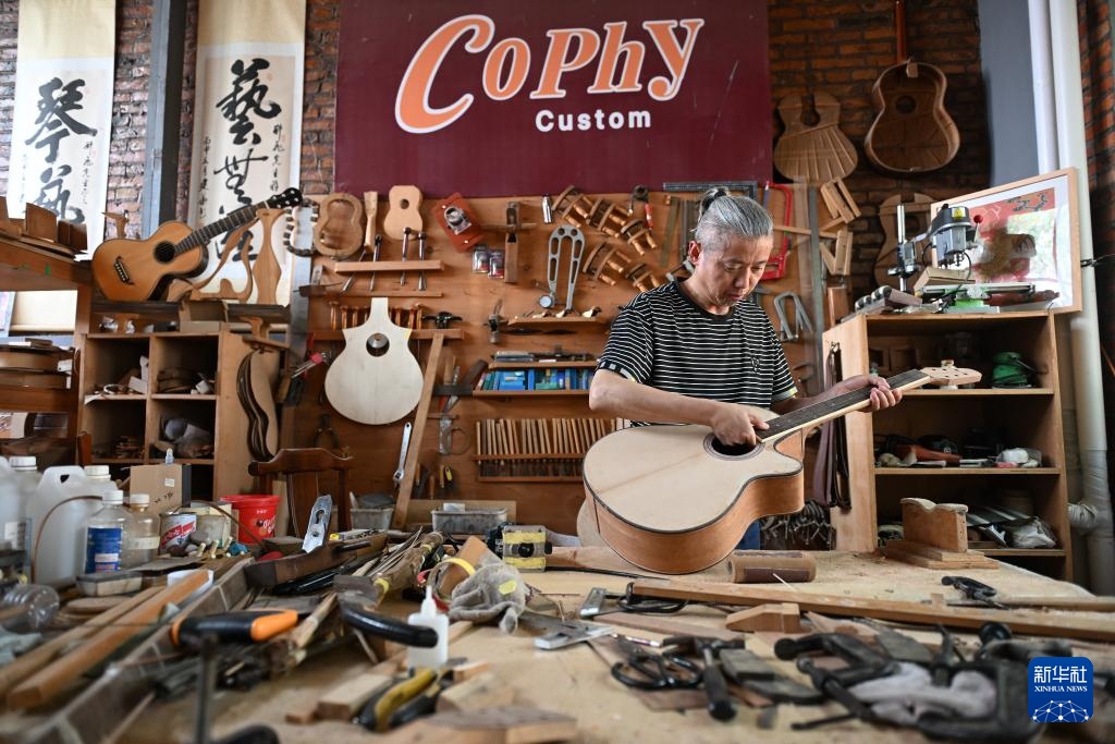 5月28日,吉他艺人在周窝音乐小镇一家吉他工坊内制作吉他。