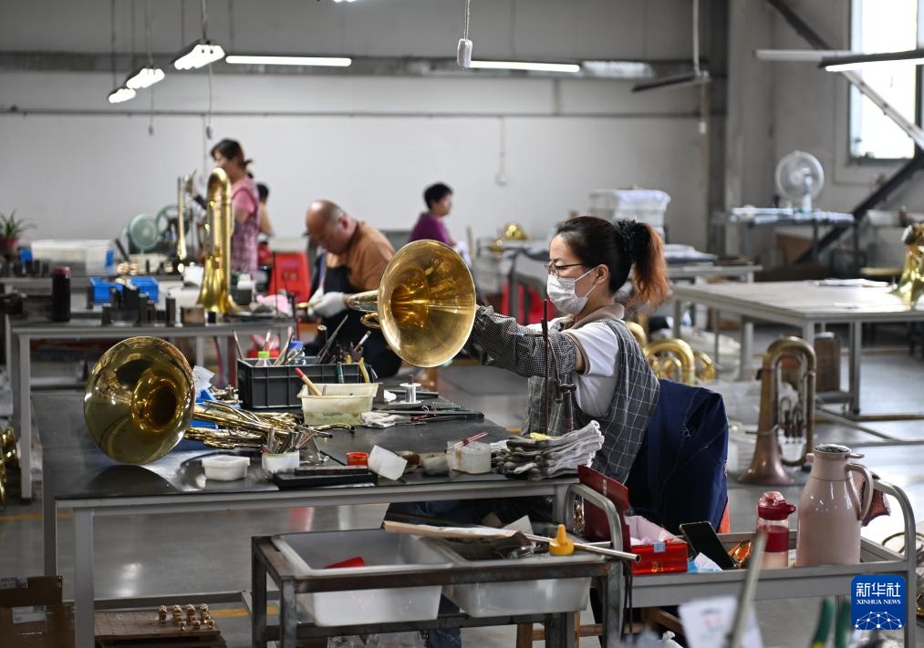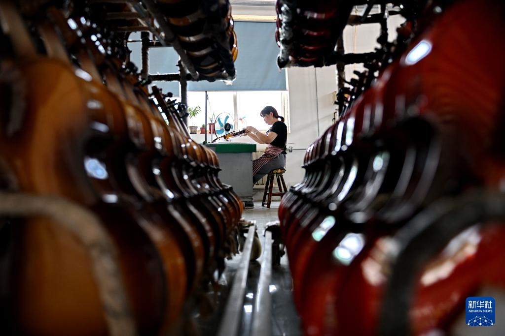 5月28日,河北省武强县一家乐器生产企业的工人在检查乐器质量。