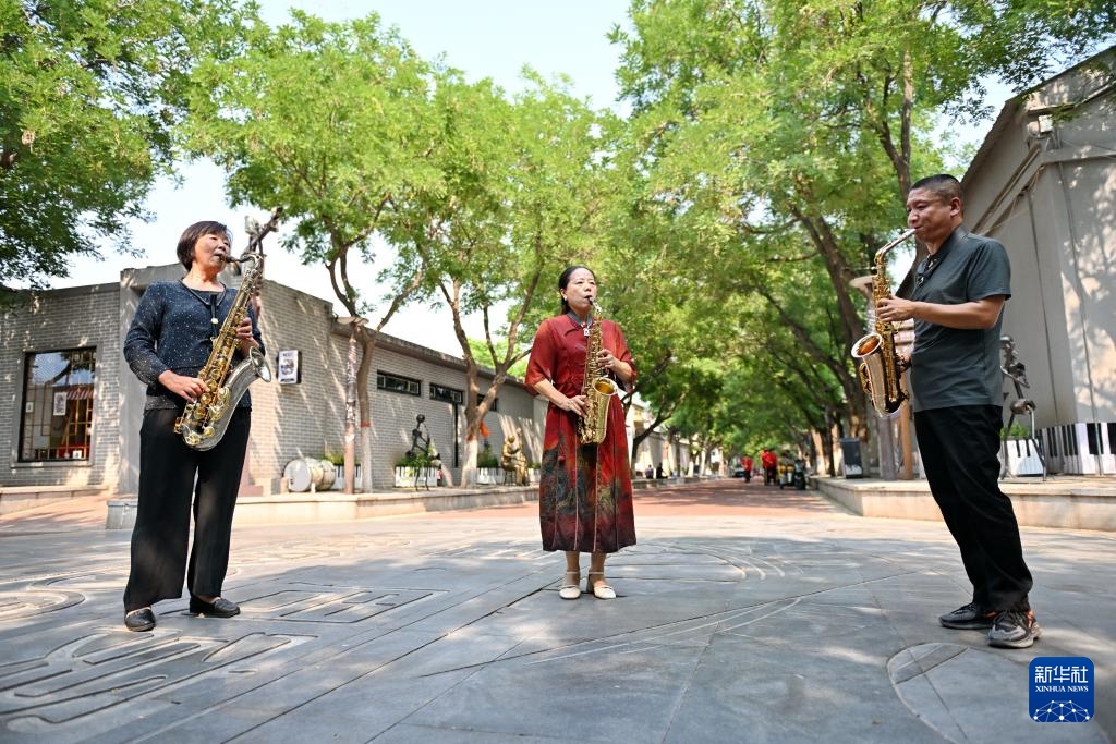 5月28日,河北省武强县周窝音乐小镇“小周工作室”经营者周卫仓(右一)在与村民一起练习萨克斯。