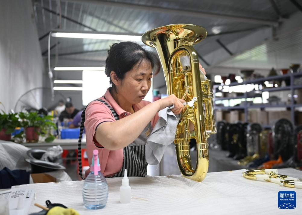 5月28日,河北省武强县一家乐器生产企业的工人在清洁乐器。