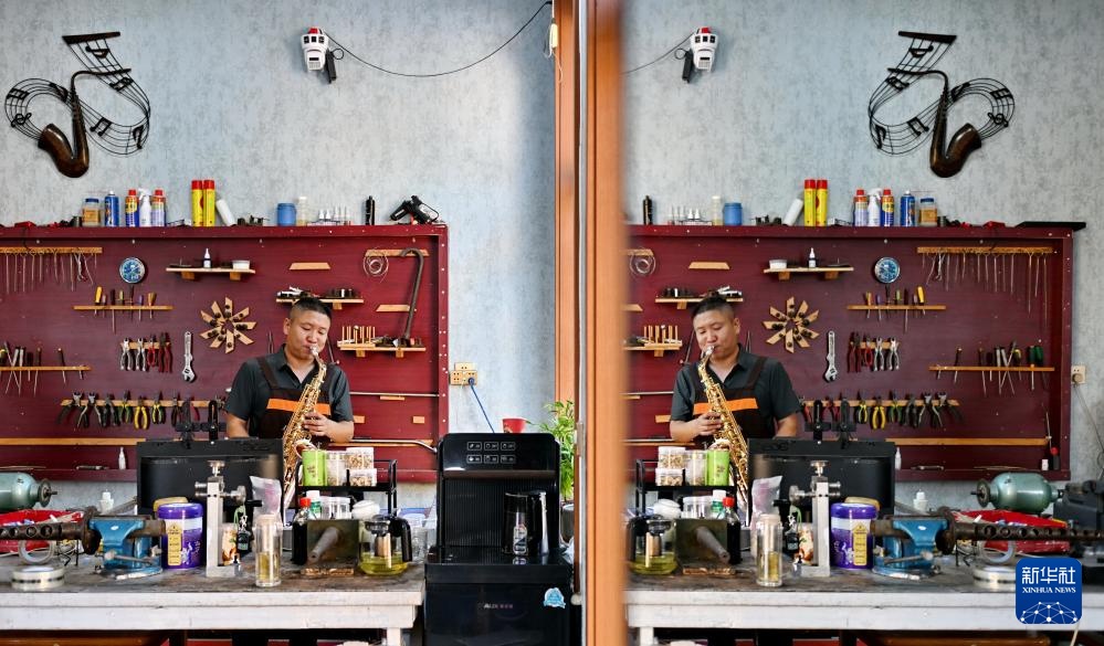 5月27日,河北省武强县周窝音乐小镇“小周工作室”经营者周卫仓在给萨克斯调音。
