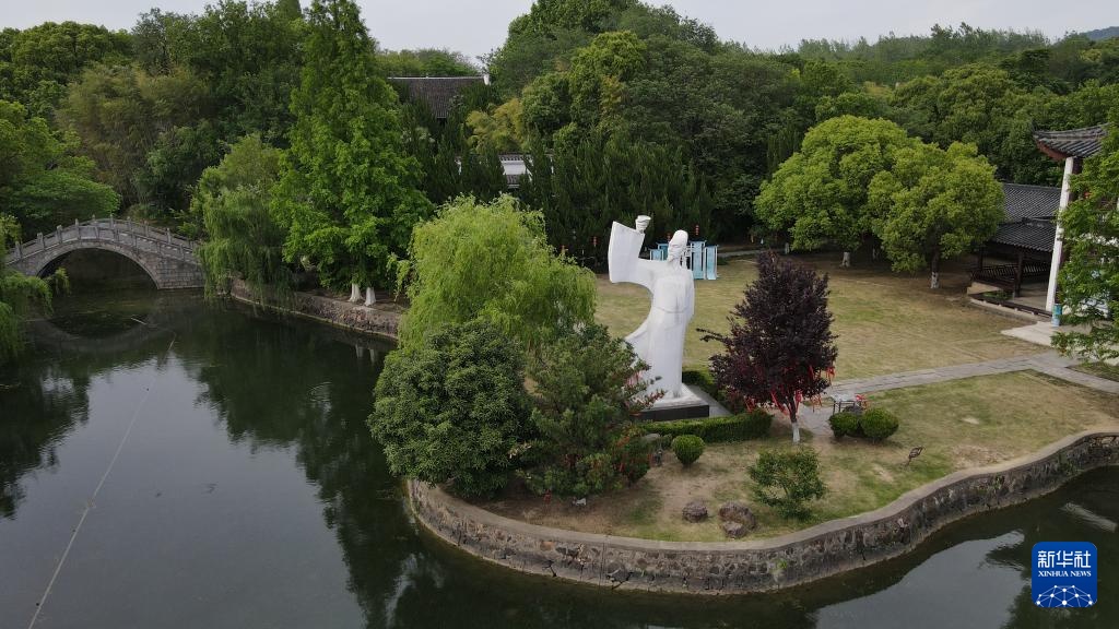 5月13日在安徽省马鞍山市当涂县拍摄的李白文化园和园中的李白雕像(无人机照片)。