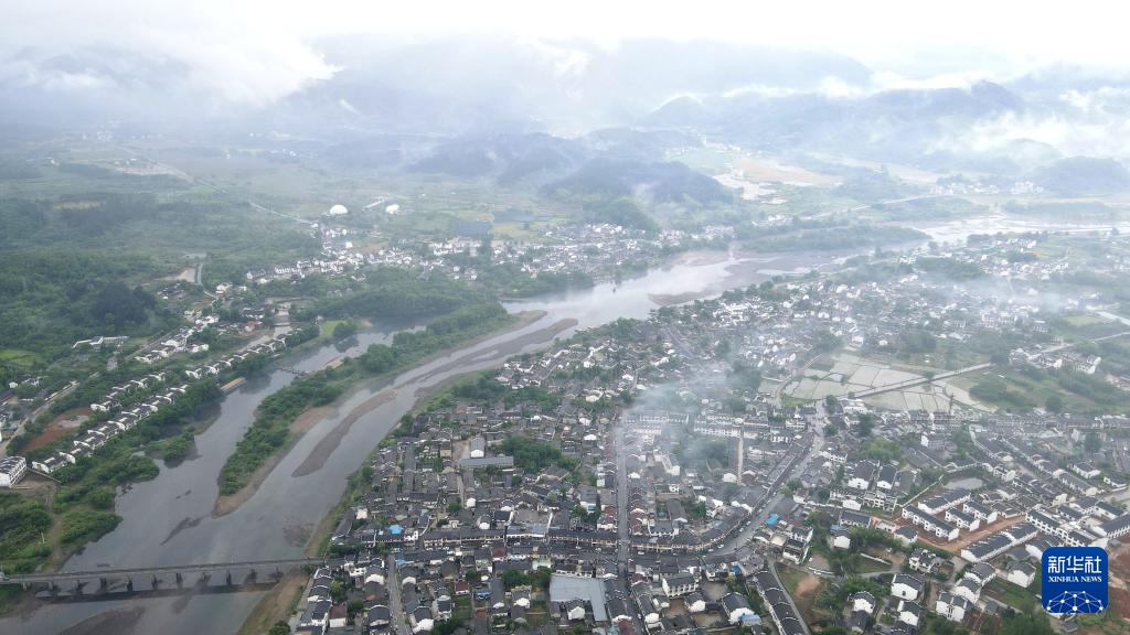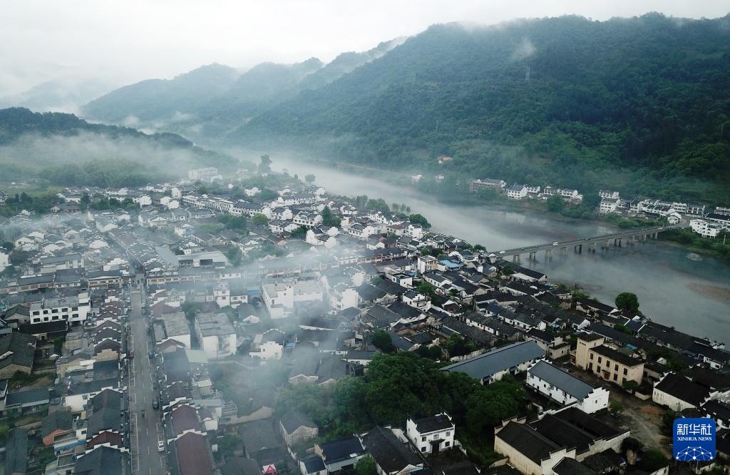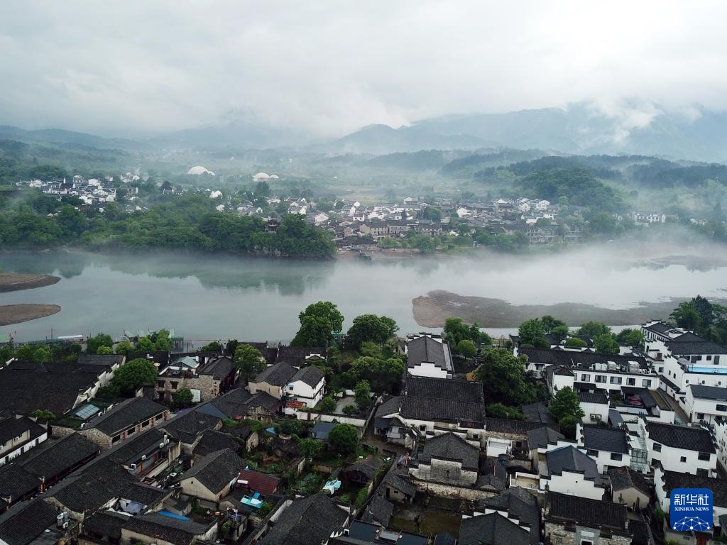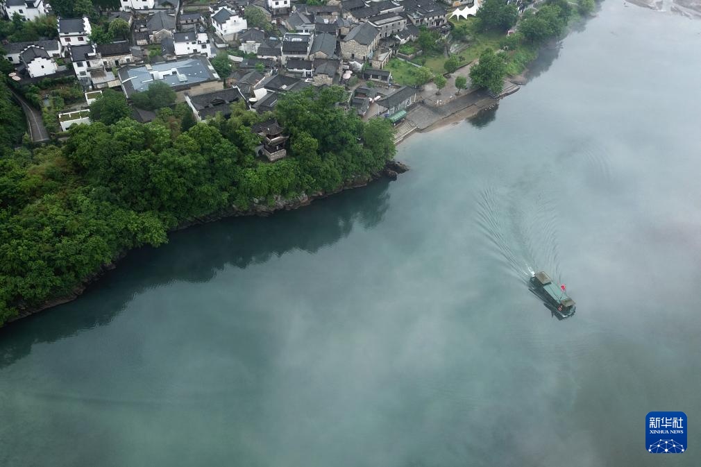 5月16日拍摄的安徽省宣城市泾县桃花潭镇雨中晨景(无人机照片)。