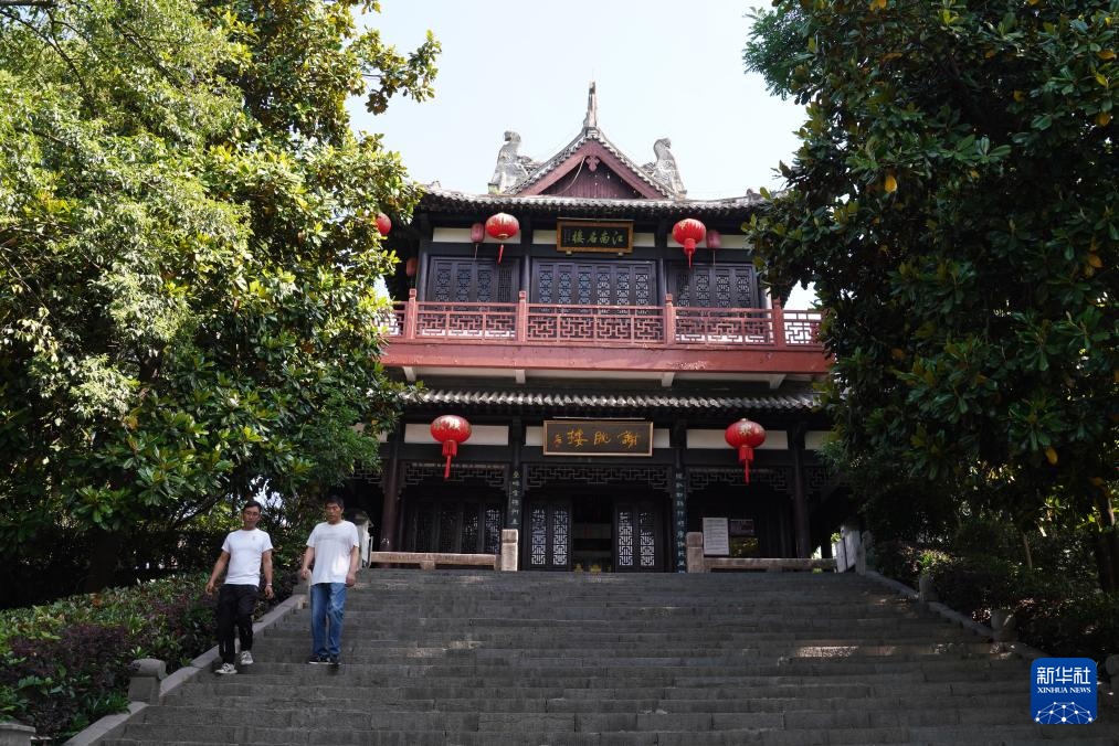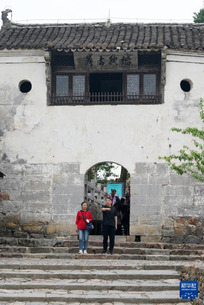 5月15日,游客在安徽省宣城市泾县桃花潭景区踏歌岸阁前驻足赏景。